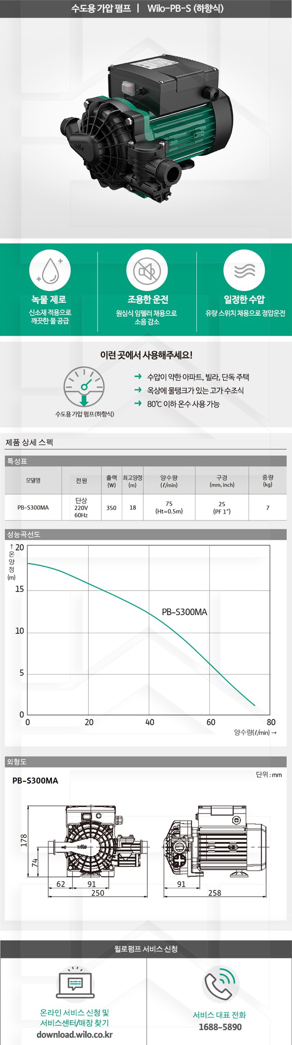 100-11-13-00000300 가압용, 수도용 PB-S300MA 판매가 216,000 ~ 원 배송방법 일반배송 브랜드 제조사 윌로펌프 주식회사 상품옵션 품명 옵션코드 규격 중량 판매단위 회원가 수량 PB-S138MA 100-11-13-00000138 15/20A 3.2kg (3,200g) 0 178,000원 - + PB-S250MA 100-11-13-00000250 20A 4.7kg (4,700g) 0 210,000원 - + PB-S300MA 100-11-13-00000300 25A 7.0kg (7,000g) 0 216,000원 - + 총 상품 금액(VAT포함) 원 회원 / 비회원 구매하기 상품담기 제품상세정보 상품문의 (0) 배송 안내 반품/교환 안내 수도용 가압 펌프 하향식 상품 문의하기 배송안내 배송 안내 일반제품 당일 1시 이전 주문시 재고 여부에 따라 당일발송 재고 부족시 2~3일 소요 파손위험제품 (화물택배/차량배송) 파손위험이 큰 제품은 빠렛트로 포장되어 차량으로 이동됩니다. 고객님이 지정한 장소와 가장 가까운 차량접근이 가능한 도로까지만 배송 주문물량 및 제품의 특성에 따라 화물, 화물택배. 합짐차량. 단독차량으로 고객님의 요청에 따라 운송 차량 지정 제품 하차시 파손이 있을 수 있으므로, 꼭 하차전 제품을 확인 고객센터 고객 센터 010-6539-7900 상담시간 오전 09시 ~ 오후 6시 점심 : 12:00 ~ 13:00 / 휴일 : 토, 일요일, 공휴일 반품/교환 안내 제품의 하자 및 오배송은 문의 주시면 즉시 처리해드리겠습니다. 반품/교환 판매자 지정택배사 : CJ대한통운 반품배송비(편도) : 3,000원 교환배송비(왕복) : 6,000원 보내실 곳 : 전라북도 전주시 완산구 콩쥐팥쥐로 1570 * 반품/교환 사유에 따른 요청 가능 기간 구매자 단순 변심 : 상품수령후 7일이내(구매자 반품 배송비 부담) 반품/교환 불가능 사유 교환/반품 요청 기간이 지난 경우 소비자의 책임 있는 사유로 상품 등이 분실/파손/훼손된 경우 소비자의 사용/소비에 의해 상품 등의 가치가 현저히 감소한 경우 제품을 설치 또는 장착하였을 경우 주문제작 상품중 상품제작에 들어간 경우 제품을 하차 또는 시공 후의 공정과정에서 일어난 파손의 경우 교환 반품시 고객 부담 배송비를 지불하지 아니한 경우 * 펌프제품은 미사용, 포장박스 미훼손 시에만 교환/반품이 가능합니다. 고객센터 고객 센터 010-6539-7900 상담시간 오전 09시 ~ 오후 6시 점심 : 12:00 ~ 13:00 / 휴일 : 토, 일요일, 공휴일