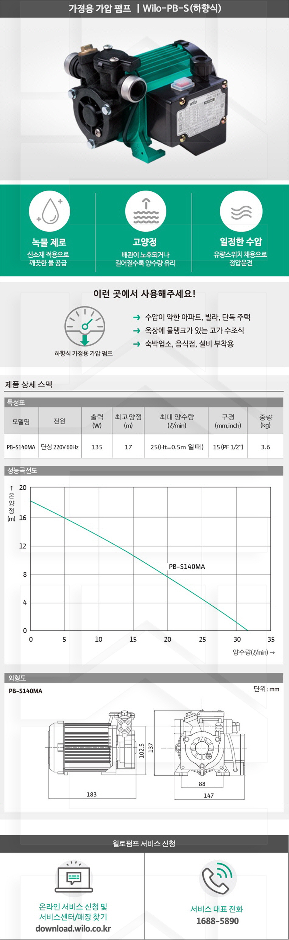 100-11-14-00000140 가압용, 수도용고양정 PB-S140MA 판매가 188,000 원 배송방법 일반배송 브랜드 제조사 윌로펌프 주식회사 상품옵션 품명 옵션코드 규격 중량 판매단위 회원가 수량 PB-S140MA 100-11-14-00000140 15A 3.6kg (3,600g) 0 188,000원 - + 총 상품 금액(VAT포함) 원 회원 / 비회원 구매하기 상품담기 제품상세정보 상품문의 (0) 배송 안내 반품/교환 안내 가정용 가압 펌프 하향식 상품 문의하기 배송안내 배송 안내 일반제품 당일 1시 이전 주문시 재고 여부에 따라 당일발송 재고 부족시 2~3일 소요 파손위험제품 (화물택배/차량배송) 파손위험이 큰 제품은 빠렛트로 포장되어 차량으로 이동됩니다. 고객님이 지정한 장소와 가장 가까운 차량접근이 가능한 도로까지만 배송 주문물량 및 제품의 특성에 따라 화물, 화물택배. 합짐차량. 단독차량으로 고객님의 요청에 따라 운송 차량 지정 제품 하차시 파손이 있을 수 있으므로, 꼭 하차전 제품을 확인 고객센터 고객 센터 010-6539-7900 상담시간 오전 09시 ~ 오후 6시 점심 : 12:00 ~ 13:00 / 휴일 : 토, 일요일, 공휴일 반품/교환 안내 제품의 하자 및 오배송은 문의 주시면 즉시 처리해드리겠습니다. 반품/교환 판매자 지정택배사 : CJ대한통운 반품배송비(편도) : 3,000원 교환배송비(왕복) : 6,000원 보내실 곳 : 전라북도 전주시 완산구 콩쥐팥쥐로 1570 * 반품/교환 사유에 따른 요청 가능 기간 구매자 단순 변심 : 상품수령후 7일이내(구매자 반품 배송비 부담) 반품/교환 불가능 사유 교환/반품 요청 기간이 지난 경우 소비자의 책임 있는 사유로 상품 등이 분실/파손/훼손된 경우 소비자의 사용/소비에 의해 상품 등의 가치가 현저히 감소한 경우 제품을 설치 또는 장착하였을 경우 주문제작 상품중 상품제작에 들어간 경우 제품을 하차 또는 시공 후의 공정과정에서 일어난 파손의 경우 교환 반품시 고객 부담 배송비를 지불하지 아니한 경우 * 펌프제품은 미사용, 포장박스 미훼손 시에만 교환/반품이 가능합니다. 고객센터 고객 센터 010-6539-7900 상담시간 오전 09시 ~ 오후 6시 점심 : 12:00 ~ 13:00 / 휴일 : 토, 일요일, 공휴일