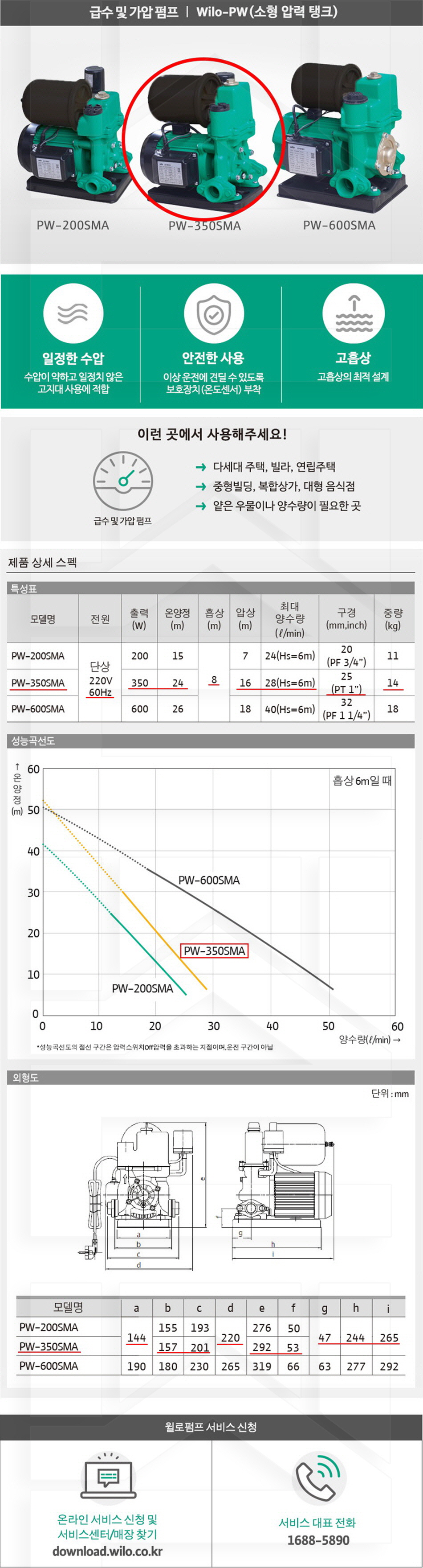 100-12-11-00000350 가정용소형, 자동식소형압력탱크 PW-350SMA 판매가 241,000 ~ 원 배송방법 일반배송 브랜드 제조사 윌로펌프 주식회사 상품옵션 품명 옵션코드 규격 중량 판매단위 회원가 수량 PW-200SMA 100-12-11-00000200 20A 11.0kg (11,000g) 0 203,000원 - + PW-350SMA 100-12-11-00000350 25A 14.0kg (14,000g) 0 241,000원 - + PW-600SMA 100-12-11-00000600 32A 18.0kg (18,000g) 0 326,000원 - + 총 상품 금액(VAT포함) 원 회원 / 비회원 구매하기 상품담기 제품상세정보 상품문의 (0) 배송 안내 반품/교환 안내 급수 가압 펌프 소형 압력 탱크 상품 문의하기 배송안내 배송 안내 일반제품 당일 1시 이전 주문시 재고 여부에 따라 당일발송 재고 부족시 2~3일 소요 파손위험제품 (화물택배/차량배송) 파손위험이 큰 제품은 빠렛트로 포장되어 차량으로 이동됩니다. 고객님이 지정한 장소와 가장 가까운 차량접근이 가능한 도로까지만 배송 주문물량 및 제품의 특성에 따라 화물, 화물택배. 합짐차량. 단독차량으로 고객님의 요청에 따라 운송 차량 지정 제품 하차시 파손이 있을 수 있으므로, 꼭 하차전 제품을 확인 고객센터 고객 센터 010-6539-7900 상담시간 오전 09시 ~ 오후 6시 점심 : 12:00 ~ 13:00 / 휴일 : 토, 일요일, 공휴일 반품/교환 안내 제품의 하자 및 오배송은 문의 주시면 즉시 처리해드리겠습니다. 반품/교환 판매자 지정택배사 : CJ대한통운 반품배송비(편도) : 3,000원 교환배송비(왕복) : 6,000원 보내실 곳 : 전라북도 전주시 완산구 콩쥐팥쥐로 1570 * 반품/교환 사유에 따른 요청 가능 기간 구매자 단순 변심 : 상품수령후 7일이내(구매자 반품 배송비 부담) 반품/교환 불가능 사유 교환/반품 요청 기간이 지난 경우 소비자의 책임 있는 사유로 상품 등이 분실/파손/훼손된 경우 소비자의 사용/소비에 의해 상품 등의 가치가 현저히 감소한 경우 제품을 설치 또는 장착하였을 경우 주문제작 상품중 상품제작에 들어간 경우 제품을 하차 또는 시공 후의 공정과정에서 일어난 파손의 경우 교환 반품시 고객 부담 배송비를 지불하지 아니한 경우 * 펌프제품은 미사용, 포장박스 미훼손 시에만 교환/반품이 가능합니다. 고객센터 고객 센터 010-6539-7900 상담시간 오전 09시 ~ 오후 6시 점심 : 12:00 ~ 13:00 / 휴일 : 토, 일요일, 공휴일