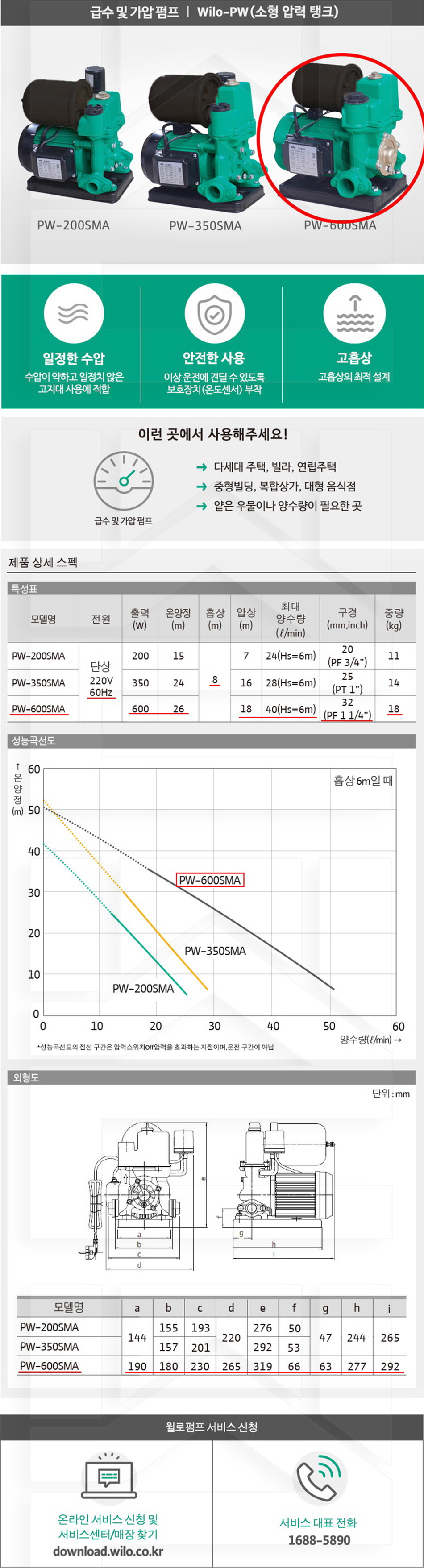 100-12-11-00000600 가정용소형, 자동식소형압력탱크 PW-600SMA 판매가 326,000 ~ 원 배송방법 일반배송 브랜드 제조사 윌로펌프 주식회사 상품옵션 품명 옵션코드 규격 중량 판매단위 회원가 수량 PW-200SMA 100-12-11-00000200 20A 11.0kg (11,000g) 0 203,000원 - + PW-350SMA 100-12-11-00000350 25A 14.0kg (14,000g) 0 241,000원 - + PW-600SMA 100-12-11-00000600 32A 18.0kg (18,000g) 0 326,000원 - + 총 상품 금액(VAT포함) 원 회원 / 비회원 구매하기 상품담기 제품상세정보 상품문의 (0) 배송 안내 반품/교환 안내 급수 가압 펌프 소형 압력 탱크 상품 문의하기 배송안내 배송 안내 일반제품 당일 1시 이전 주문시 재고 여부에 따라 당일발송 재고 부족시 2~3일 소요 파손위험제품 (화물택배/차량배송) 파손위험이 큰 제품은 빠렛트로 포장되어 차량으로 이동됩니다. 고객님이 지정한 장소와 가장 가까운 차량접근이 가능한 도로까지만 배송 주문물량 및 제품의 특성에 따라 화물, 화물택배. 합짐차량. 단독차량으로 고객님의 요청에 따라 운송 차량 지정 제품 하차시 파손이 있을 수 있으므로, 꼭 하차전 제품을 확인 고객센터 고객 센터 010-6539-7900 상담시간 오전 09시 ~ 오후 6시 점심 : 12:00 ~ 13:00 / 휴일 : 토, 일요일, 공휴일 반품/교환 안내 제품의 하자 및 오배송은 문의 주시면 즉시 처리해드리겠습니다. 반품/교환 판매자 지정택배사 : CJ대한통운 반품배송비(편도) : 3,000원 교환배송비(왕복) : 6,000원 보내실 곳 : 전라북도 전주시 완산구 콩쥐팥쥐로 1570 * 반품/교환 사유에 따른 요청 가능 기간 구매자 단순 변심 : 상품수령후 7일이내(구매자 반품 배송비 부담) 반품/교환 불가능 사유 교환/반품 요청 기간이 지난 경우 소비자의 책임 있는 사유로 상품 등이 분실/파손/훼손된 경우 소비자의 사용/소비에 의해 상품 등의 가치가 현저히 감소한 경우 제품을 설치 또는 장착하였을 경우 주문제작 상품중 상품제작에 들어간 경우 제품을 하차 또는 시공 후의 공정과정에서 일어난 파손의 경우 교환 반품시 고객 부담 배송비를 지불하지 아니한 경우 * 펌프제품은 미사용, 포장박스 미훼손 시에만 교환/반품이 가능합니다. 고객센터 고객 센터 010-6539-7900 상담시간 오전 09시 ~ 오후 6시 점심 : 12:00 ~ 13:00 / 휴일 : 토, 일요일, 공휴일
