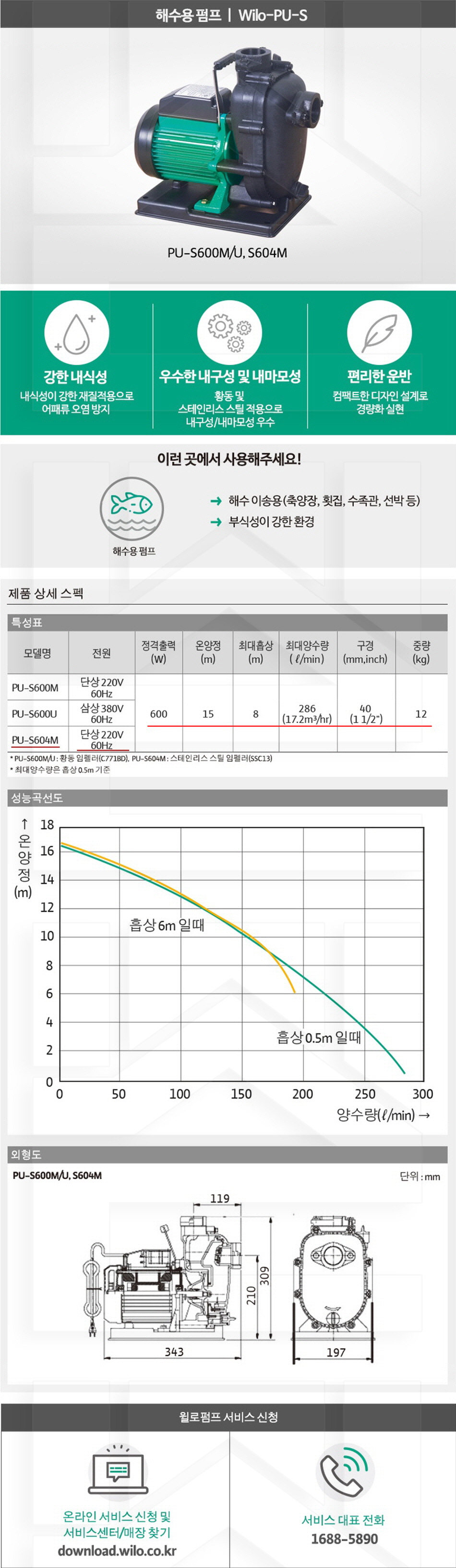 100-27-11-00000604 해수용펌프 스텐임펠러 PU-S604M 판매가 278,000 ~ 원 배송방법 일반배송 브랜드 제조사 윌로펌프 주식회사 상품옵션 품명 옵션코드 규격 중량 판매단위 회원가 수량 PU-S604M 100-27-11-00000604 40A 12.0kg (12,000g) 0 278,000원 - + PU-S990M/H 100-27-11-00000990 50A 22.0kg (22,000g) 0 533,000원 - + PU-S1700M 100-27-11-00001700 50A 32.0kg (32,000g) 0 662,000원 - + PU-S3001M 100-27-11-00003001 80A 47.0kg (47,000g) 0 785,000원 - + 총 상품 금액(VAT포함) 원 회원 / 비회원 구매하기 상품담기 제품상세정보 상품문의 (0) 배송 안내 반품/교환 안내 해수용 펌프 상품 문의하기 배송안내 배송 안내 일반제품 당일 1시 이전 주문시 재고 여부에 따라 당일발송 재고 부족시 2~3일 소요 파손위험제품 (화물택배/차량배송) 파손위험이 큰 제품은 빠렛트로 포장되어 차량으로 이동됩니다. 고객님이 지정한 장소와 가장 가까운 차량접근이 가능한 도로까지만 배송 주문물량 및 제품의 특성에 따라 화물, 화물택배. 합짐차량. 단독차량으로 고객님의 요청에 따라 운송 차량 지정 제품 하차시 파손이 있을 수 있으므로, 꼭 하차전 제품을 확인 고객센터 고객 센터 010-6539-7900 상담시간 오전 09시 ~ 오후 6시 점심 : 12:00 ~ 13:00 / 휴일 : 토, 일요일, 공휴일 반품/교환 안내 제품의 하자 및 오배송은 문의 주시면 즉시 처리해드리겠습니다. 반품/교환 판매자 지정택배사 : CJ대한통운 반품배송비(편도) : 3,000원 교환배송비(왕복) : 6,000원 보내실 곳 : 전라북도 전주시 완산구 콩쥐팥쥐로 1570 * 반품/교환 사유에 따른 요청 가능 기간 구매자 단순 변심 : 상품수령후 7일이내(구매자 반품 배송비 부담) 반품/교환 불가능 사유 교환/반품 요청 기간이 지난 경우 소비자의 책임 있는 사유로 상품 등이 분실/파손/훼손된 경우 소비자의 사용/소비에 의해 상품 등의 가치가 현저히 감소한 경우 제품을 설치 또는 장착하였을 경우 주문제작 상품중 상품제작에 들어간 경우 제품을 하차 또는 시공 후의 공정과정에서 일어난 파손의 경우 교환 반품시 고객 부담 배송비를 지불하지 아니한 경우 * 펌프제품은 미사용, 포장박스 미훼손 시에만 교환/반품이 가능합니다. 고객센터 고객 센터 010-6539-7900 상담시간 오전 09시 ~ 오후 6시 점심 : 12:00 ~ 13:00 / 휴일 : 토, 일요일, 공휴일