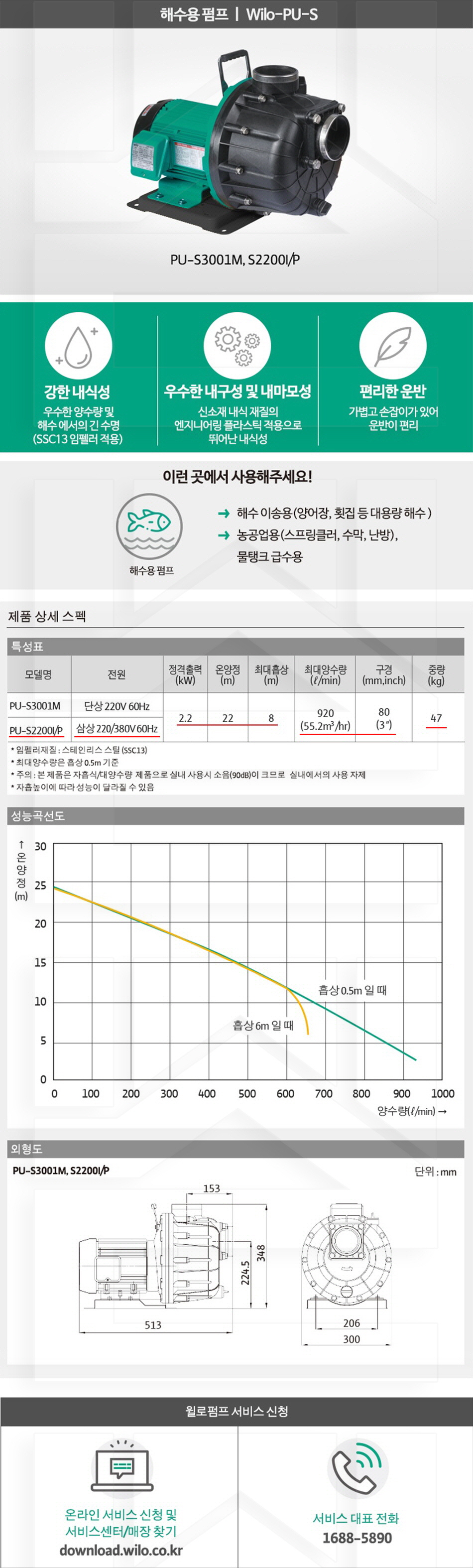 100-27-12-00002200 해수용펌프 스텐임펠러 삼상, 구PU-S3001I PU-S2200I/P 판매가 785,000 ~ 원 배송방법 일반배송 브랜드 제조사 윌로펌프 주식회사 상품옵션 품명 옵션코드 규격 중량 판매단위 회원가 수량 PU-S1100U/P 100-27-12-00001100 50A 22.0kg (22,000g) 0 543,000원 - + PU-S1800I/P 100-27-12-00001800 50A 32.0kg (32,000g) 0 662,000원 - + PU-S2200I/P 100-27-12-00002200 80A 47.0kg (47,000g) 0 785,000원 - + 총 상품 금액(VAT포함) 원 회원 / 비회원 구매하기 상품담기 제품상세정보 상품문의 (0) 배송 안내 반품/교환 안내 해수용 펌프 상품 문의하기 배송안내 배송 안내 일반제품 당일 1시 이전 주문시 재고 여부에 따라 당일발송 재고 부족시 2~3일 소요 파손위험제품 (화물택배/차량배송) 파손위험이 큰 제품은 빠렛트로 포장되어 차량으로 이동됩니다. 고객님이 지정한 장소와 가장 가까운 차량접근이 가능한 도로까지만 배송 주문물량 및 제품의 특성에 따라 화물, 화물택배. 합짐차량. 단독차량으로 고객님의 요청에 따라 운송 차량 지정 제품 하차시 파손이 있을 수 있으므로, 꼭 하차전 제품을 확인 고객센터 고객 센터 010-6539-7900 상담시간 오전 09시 ~ 오후 6시 점심 : 12:00 ~ 13:00 / 휴일 : 토, 일요일, 공휴일 반품/교환 안내 제품의 하자 및 오배송은 문의 주시면 즉시 처리해드리겠습니다. 반품/교환 판매자 지정택배사 : CJ대한통운 반품배송비(편도) : 3,000원 교환배송비(왕복) : 6,000원 보내실 곳 : 전라북도 전주시 완산구 콩쥐팥쥐로 1570 * 반품/교환 사유에 따른 요청 가능 기간 구매자 단순 변심 : 상품수령후 7일이내(구매자 반품 배송비 부담) 반품/교환 불가능 사유 교환/반품 요청 기간이 지난 경우 소비자의 책임 있는 사유로 상품 등이 분실/파손/훼손된 경우 소비자의 사용/소비에 의해 상품 등의 가치가 현저히 감소한 경우 제품을 설치 또는 장착하였을 경우 주문제작 상품중 상품제작에 들어간 경우 제품을 하차 또는 시공 후의 공정과정에서 일어난 파손의 경우 교환 반품시 고객 부담 배송비를 지불하지 아니한 경우 * 펌프제품은 미사용, 포장박스 미훼손 시에만 교환/반품이 가능합니다. 고객센터 고객 센터 010-6539-7900 상담시간 오전 09시 ~ 오후 6시 점심 : 12:00 ~ 13:00 / 휴일 : 토, 일요일, 공휴일