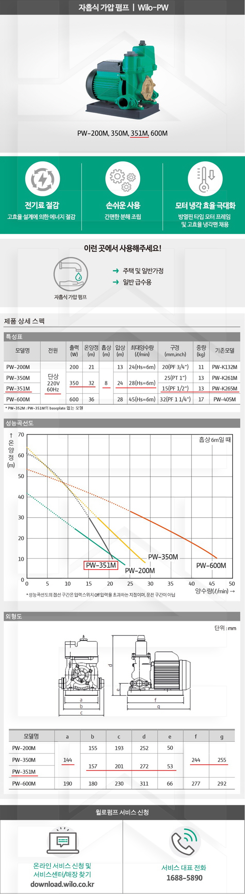 100-31-11-00000351 다목적용, 자흡식가압펌프 PW-351M 판매가 218,000 ~ 원 배송방법 일반배송 브랜드 제조사 윌로펌프 주식회사 상품옵션 품명 옵션코드 규격 중량 판매단위 회원가 수량 PW-200M 100-31-11-00000200 20A 11.0kg (11,000g) 0 184,000원 - + PW-350M 100-31-11-00000350 25A 13.0kg (13,000g) 0 223,000원 - + PW-351M 100-31-11-00000351 15A 13.0kg (13,000g) 0 218,000원 - + PW-352M 100-31-11-00000352 15A 13.0kg (13,000g) 0 189,000원 - + PW-600M 100-31-11-00000600 32A 17.0kg (17,000g) 0 274,000원 - + PW-952M/H 100-31-11-00000952 40A 23.0kg (23,000g) 0 405,000원 - + PW-2200M 100-31-11-00002200 40A 34.0kg (34,000g) 0 531,000원 - + 총 상품 금액(VAT포함) 원 회원 / 비회원 구매하기 상품담기 제품상세정보 상품문의 (0) 배송 안내 반품/교환 안내 자흡식 가압 펌프 상품 문의하기 배송안내 배송 안내 일반제품 당일 1시 이전 주문시 재고 여부에 따라 당일발송 재고 부족시 2~3일 소요 파손위험제품 (화물택배/차량배송) 파손위험이 큰 제품은 빠렛트로 포장되어 차량으로 이동됩니다. 고객님이 지정한 장소와 가장 가까운 차량접근이 가능한 도로까지만 배송 주문물량 및 제품의 특성에 따라 화물, 화물택배. 합짐차량. 단독차량으로 고객님의 요청에 따라 운송 차량 지정 제품 하차시 파손이 있을 수 있으므로, 꼭 하차전 제품을 확인 고객센터 고객 센터 010-6539-7900 상담시간 오전 09시 ~ 오후 6시 점심 : 12:00 ~ 13:00 / 휴일 : 토, 일요일, 공휴일 반품/교환 안내 제품의 하자 및 오배송은 문의 주시면 즉시 처리해드리겠습니다. 반품/교환 판매자 지정택배사 : CJ대한통운 반품배송비(편도) : 3,000원 교환배송비(왕복) : 6,000원 보내실 곳 : 전라북도 전주시 완산구 콩쥐팥쥐로 1570 * 반품/교환 사유에 따른 요청 가능 기간 구매자 단순 변심 : 상품수령후 7일이내(구매자 반품 배송비 부담) 반품/교환 불가능 사유 교환/반품 요청 기간이 지난 경우 소비자의 책임 있는 사유로 상품 등이 분실/파손/훼손된 경우 소비자의 사용/소비에 의해 상품 등의 가치가 현저히 감소한 경우 제품을 설치 또는 장착하였을 경우 주문제작 상품중 상품제작에 들어간 경우 제품을 하차 또는 시공 후의 공정과정에서 일어난 파손의 경우 교환 반품시 고객 부담 배송비를 지불하지 아니한 경우 * 펌프제품은 미사용, 포장박스 미훼손 시에만 교환/반품이 가능합니다. 고객센터 고객 센터 010-6539-7900 상담시간 오전 09시 ~ 오후 6시 점심 : 12:00 ~ 13:00 / 휴일 : 토, 일요일, 공휴일