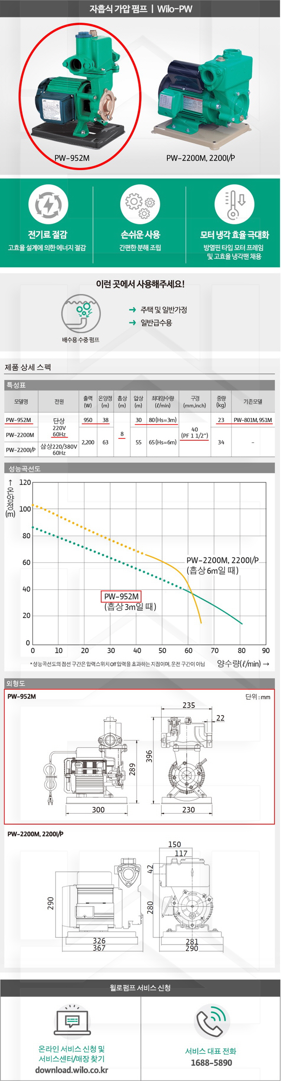 100-31-11-00000952 다목적용, 자흡식가압펌프, 구PW-952M PW-952M/H 판매가 405,000 ~ 원 배송방법 일반배송 브랜드 제조사 윌로펌프 주식회사 상품옵션 품명 옵션코드 규격 중량 판매단위 회원가 수량 PW-200M 100-31-11-00000200 20A 11.0kg (11,000g) 0 184,000원 - + PW-350M 100-31-11-00000350 25A 13.0kg (13,000g) 0 223,000원 - + PW-351M 100-31-11-00000351 15A 13.0kg (13,000g) 0 218,000원 - + PW-352M 100-31-11-00000352 15A 13.0kg (13,000g) 0 189,000원 - + PW-600M 100-31-11-00000600 32A 17.0kg (17,000g) 0 274,000원 - + PW-952M/H 100-31-11-00000952 40A 23.0kg (23,000g) 0 405,000원 - + PW-2200M 100-31-11-00002200 40A 34.0kg (34,000g) 0 531,000원 - + 총 상품 금액(VAT포함) 원 회원 / 비회원 구매하기 상품담기 제품상세정보 상품문의 (0) 배송 안내 반품/교환 안내 자흡식 가압 펌프 상품 문의하기 배송안내 배송 안내 일반제품 당일 1시 이전 주문시 재고 여부에 따라 당일발송 재고 부족시 2~3일 소요 파손위험제품 (화물택배/차량배송) 파손위험이 큰 제품은 빠렛트로 포장되어 차량으로 이동됩니다. 고객님이 지정한 장소와 가장 가까운 차량접근이 가능한 도로까지만 배송 주문물량 및 제품의 특성에 따라 화물, 화물택배. 합짐차량. 단독차량으로 고객님의 요청에 따라 운송 차량 지정 제품 하차시 파손이 있을 수 있으므로, 꼭 하차전 제품을 확인 고객센터 고객 센터 010-6539-7900 상담시간 오전 09시 ~ 오후 6시 점심 : 12:00 ~ 13:00 / 휴일 : 토, 일요일, 공휴일 반품/교환 안내 제품의 하자 및 오배송은 문의 주시면 즉시 처리해드리겠습니다. 반품/교환 판매자 지정택배사 : CJ대한통운 반품배송비(편도) : 3,000원 교환배송비(왕복) : 6,000원 보내실 곳 : 전라북도 전주시 완산구 콩쥐팥쥐로 1570 * 반품/교환 사유에 따른 요청 가능 기간 구매자 단순 변심 : 상품수령후 7일이내(구매자 반품 배송비 부담) 반품/교환 불가능 사유 교환/반품 요청 기간이 지난 경우 소비자의 책임 있는 사유로 상품 등이 분실/파손/훼손된 경우 소비자의 사용/소비에 의해 상품 등의 가치가 현저히 감소한 경우 제품을 설치 또는 장착하였을 경우 주문제작 상품중 상품제작에 들어간 경우 제품을 하차 또는 시공 후의 공정과정에서 일어난 파손의 경우 교환 반품시 고객 부담 배송비를 지불하지 아니한 경우 * 펌프제품은 미사용, 포장박스 미훼손 시에만 교환/반품이 가능합니다. 고객센터 고객 센터 010-6539-7900 상담시간 오전 09시 ~ 오후 6시 점심 : 12:00 ~ 13:00 / 휴일 : 토, 일요일, 공휴일