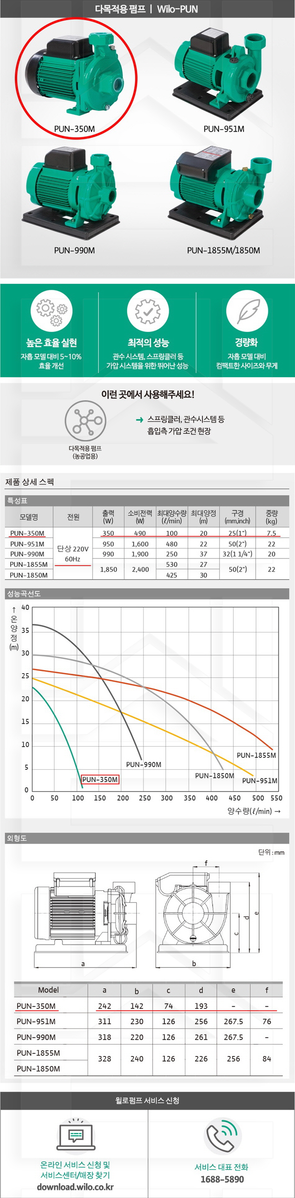 100-35-11-00000350 다목적용, 원심식비자동펌프 PUN-350M 판매가 143,000 ~ 원 배송방법 일반배송 브랜드 제조사 윌로펌프 주식회사 상품옵션 품명 옵션코드 규격 중량 판매단위 회원가 수량 PUN-350M 100-35-11-00000350 25A 7.5kg (7,500g) 0 143,000원 - + PUN-951M/H 100-35-11-00000951 50A 22.0kg (22,000g) 0 317,000원 - + PUN-990M 100-35-11-00000990 32A 20.0kg (20,000g) 0 319,000원 - + 총 상품 금액(VAT포함) 원 회원 / 비회원 구매하기 상품담기 제품상세정보 상품문의 (0) 배송 안내 반품/교환 안내 다목적용 펌프 상품 문의하기 배송안내 배송 안내 일반제품 당일 1시 이전 주문시 재고 여부에 따라 당일발송 재고 부족시 2~3일 소요 파손위험제품 (화물택배/차량배송) 파손위험이 큰 제품은 빠렛트로 포장되어 차량으로 이동됩니다. 고객님이 지정한 장소와 가장 가까운 차량접근이 가능한 도로까지만 배송 주문물량 및 제품의 특성에 따라 화물, 화물택배. 합짐차량. 단독차량으로 고객님의 요청에 따라 운송 차량 지정 제품 하차시 파손이 있을 수 있으므로, 꼭 하차전 제품을 확인 고객센터 고객 센터 010-6539-7900 상담시간 오전 09시 ~ 오후 6시 점심 : 12:00 ~ 13:00 / 휴일 : 토, 일요일, 공휴일 반품/교환 안내 제품의 하자 및 오배송은 문의 주시면 즉시 처리해드리겠습니다. 반품/교환 판매자 지정택배사 : CJ대한통운 반품배송비(편도) : 3,000원 교환배송비(왕복) : 6,000원 보내실 곳 : 전라북도 전주시 완산구 콩쥐팥쥐로 1570 * 반품/교환 사유에 따른 요청 가능 기간 구매자 단순 변심 : 상품수령후 7일이내(구매자 반품 배송비 부담) 반품/교환 불가능 사유 교환/반품 요청 기간이 지난 경우 소비자의 책임 있는 사유로 상품 등이 분실/파손/훼손된 경우 소비자의 사용/소비에 의해 상품 등의 가치가 현저히 감소한 경우 제품을 설치 또는 장착하였을 경우 주문제작 상품중 상품제작에 들어간 경우 제품을 하차 또는 시공 후의 공정과정에서 일어난 파손의 경우 교환 반품시 고객 부담 배송비를 지불하지 아니한 경우 * 펌프제품은 미사용, 포장박스 미훼손 시에만 교환/반품이 가능합니다. 고객센터 고객 센터 010-6539-7900 상담시간 오전 09시 ~ 오후 6시 점심 : 12:00 ~ 13:00 / 휴일 : 토, 일요일, 공휴일