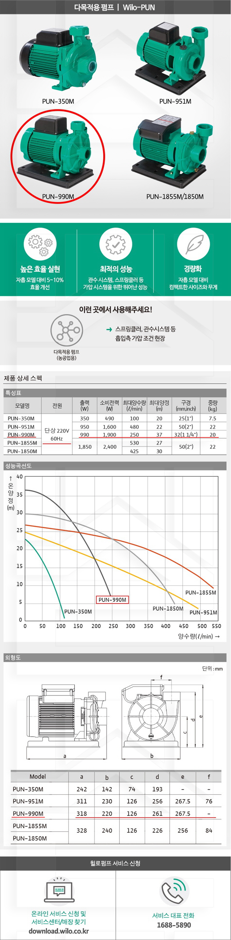 100-35-11-00000990 다목적용, 원심식비자동펌프 PUN-990M 판매가 319,000 ~ 원 배송방법 일반배송 브랜드 제조사 윌로펌프 주식회사 상품옵션 품명 옵션코드 규격 중량 판매단위 회원가 수량 PUN-350M 100-35-11-00000350 25A 7.5kg (7,500g) 0 143,000원 - + PUN-951M/H 100-35-11-00000951 50A 22.0kg (22,000g) 0 317,000원 - + PUN-990M 100-35-11-00000990 32A 20.0kg (20,000g) 0 319,000원 - + 총 상품 금액(VAT포함) 원 회원 / 비회원 구매하기 상품담기 제품상세정보 상품문의 (0) 배송 안내 반품/교환 안내 다목적용 펌프 상품 문의하기 배송안내 배송 안내 일반제품 당일 1시 이전 주문시 재고 여부에 따라 당일발송 재고 부족시 2~3일 소요 파손위험제품 (화물택배/차량배송) 파손위험이 큰 제품은 빠렛트로 포장되어 차량으로 이동됩니다. 고객님이 지정한 장소와 가장 가까운 차량접근이 가능한 도로까지만 배송 주문물량 및 제품의 특성에 따라 화물, 화물택배. 합짐차량. 단독차량으로 고객님의 요청에 따라 운송 차량 지정 제품 하차시 파손이 있을 수 있으므로, 꼭 하차전 제품을 확인 고객센터 고객 센터 010-6539-7900 상담시간 오전 09시 ~ 오후 6시 점심 : 12:00 ~ 13:00 / 휴일 : 토, 일요일, 공휴일 반품/교환 안내 제품의 하자 및 오배송은 문의 주시면 즉시 처리해드리겠습니다. 반품/교환 판매자 지정택배사 : CJ대한통운 반품배송비(편도) : 3,000원 교환배송비(왕복) : 6,000원 보내실 곳 : 전라북도 전주시 완산구 콩쥐팥쥐로 1570 * 반품/교환 사유에 따른 요청 가능 기간 구매자 단순 변심 : 상품수령후 7일이내(구매자 반품 배송비 부담) 반품/교환 불가능 사유 교환/반품 요청 기간이 지난 경우 소비자의 책임 있는 사유로 상품 등이 분실/파손/훼손된 경우 소비자의 사용/소비에 의해 상품 등의 가치가 현저히 감소한 경우 제품을 설치 또는 장착하였을 경우 주문제작 상품중 상품제작에 들어간 경우 제품을 하차 또는 시공 후의 공정과정에서 일어난 파손의 경우 교환 반품시 고객 부담 배송비를 지불하지 아니한 경우 * 펌프제품은 미사용, 포장박스 미훼손 시에만 교환/반품이 가능합니다. 고객센터 고객 센터 010-6539-7900 상담시간 오전 09시 ~ 오후 6시 점심 : 12:00 ~ 13:00 / 휴일 : 토, 일요일, 공휴일