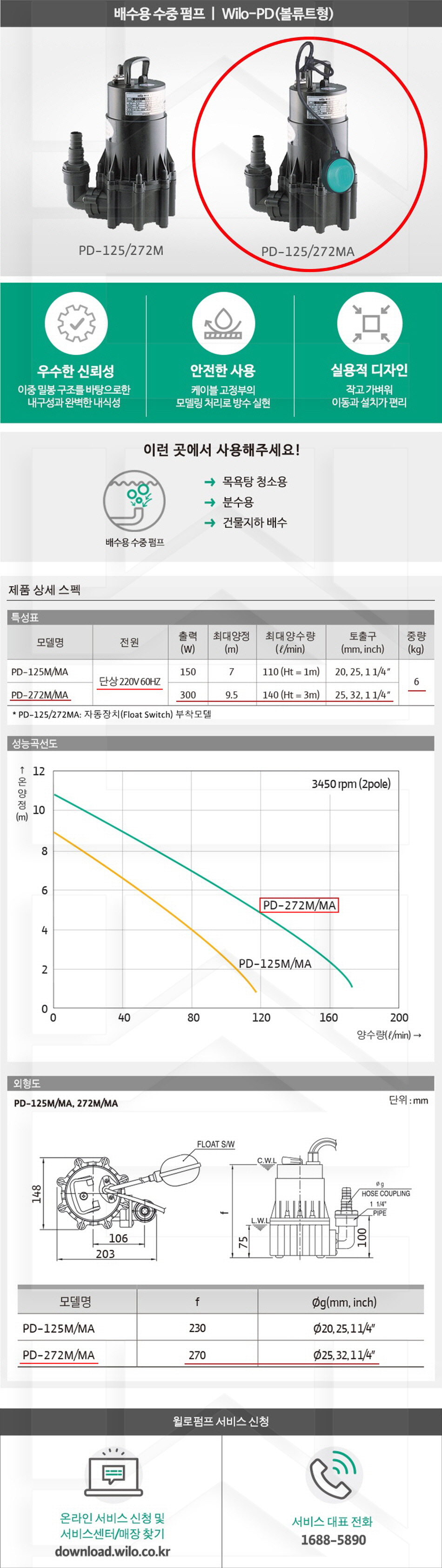 100-52-11-00000272 배수용수중자동, 편수용 PD-272MA 판매가 218,000 ~ 원 배송방법 일반배송 브랜드 제조사 윌로펌프 주식회사 상품옵션 품명 옵션코드 규격 중량 판매단위 회원가 수량 PD-125MA 100-52-11-00000125 20/25A 6.0kg (6,000g) 0 185,000원 - + PD-272MA 100-52-11-00000272 32A호스타입 6.0kg (6,000g) 0 218,000원 - + 총 상품 금액(VAT포함) 원 회원 / 비회원 구매하기 상품담기 제품상세정보 상품문의 (0) 배송 안내 반품/교환 안내 배수용 수중 펌프 볼류트형 상품 문의하기 배송안내 배송 안내 일반제품 당일 1시 이전 주문시 재고 여부에 따라 당일발송 재고 부족시 2~3일 소요 파손위험제품 (화물택배/차량배송) 파손위험이 큰 제품은 빠렛트로 포장되어 차량으로 이동됩니다. 고객님이 지정한 장소와 가장 가까운 차량접근이 가능한 도로까지만 배송 주문물량 및 제품의 특성에 따라 화물, 화물택배. 합짐차량. 단독차량으로 고객님의 요청에 따라 운송 차량 지정 제품 하차시 파손이 있을 수 있으므로, 꼭 하차전 제품을 확인 고객센터 고객 센터 010-6539-7900 상담시간 오전 09시 ~ 오후 6시 점심 : 12:00 ~ 13:00 / 휴일 : 토, 일요일, 공휴일 반품/교환 안내 제품의 하자 및 오배송은 문의 주시면 즉시 처리해드리겠습니다. 반품/교환 판매자 지정택배사 : CJ대한통운 반품배송비(편도) : 3,000원 교환배송비(왕복) : 6,000원 보내실 곳 : 전라북도 전주시 완산구 콩쥐팥쥐로 1570 * 반품/교환 사유에 따른 요청 가능 기간 구매자 단순 변심 : 상품수령후 7일이내(구매자 반품 배송비 부담) 반품/교환 불가능 사유 교환/반품 요청 기간이 지난 경우 소비자의 책임 있는 사유로 상품 등이 분실/파손/훼손된 경우 소비자의 사용/소비에 의해 상품 등의 가치가 현저히 감소한 경우 제품을 설치 또는 장착하였을 경우 주문제작 상품중 상품제작에 들어간 경우 제품을 하차 또는 시공 후의 공정과정에서 일어난 파손의 경우 교환 반품시 고객 부담 배송비를 지불하지 아니한 경우 * 펌프제품은 미사용, 포장박스 미훼손 시에만 교환/반품이 가능합니다. 고객센터 고객 센터 010-6539-7900 상담시간 오전 09시 ~ 오후 6시 점심 : 12:00 ~ 13:00 / 휴일 : 토, 일요일, 공휴일