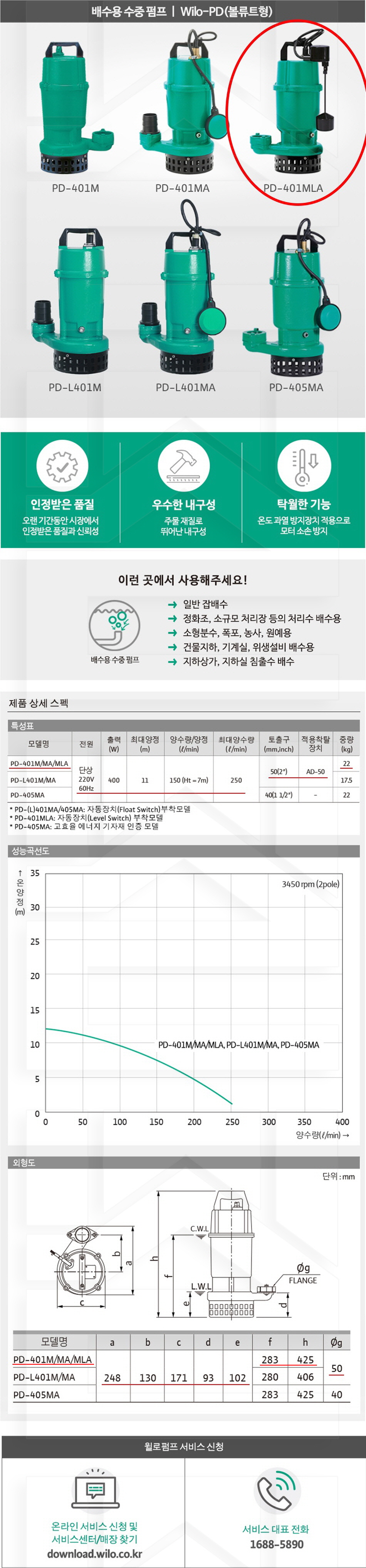 100-54-12-00000401 배수용수중자동레벨스위치형, 잡배수용 PD-401MLA 판매가 382,000 원 배송방법 일반배송 브랜드 제조사 윌로펌프 주식회사 상품옵션 품명 옵션코드 규격 중량 판매단위 회원가 수량 PD-401MLA 100-54-12-00000401 50A 19.0kg (19,000g) 0 382,000원 - + 총 상품 금액(VAT포함) 원 회원 / 비회원 구매하기 상품담기 제품상세정보 상품문의 (0) 배송 안내 반품/교환 안내 배수용 수중 펌프 볼류트형 상품 문의하기 배송안내 배송 안내 일반제품 당일 1시 이전 주문시 재고 여부에 따라 당일발송 재고 부족시 2~3일 소요 파손위험제품 (화물택배/차량배송) 파손위험이 큰 제품은 빠렛트로 포장되어 차량으로 이동됩니다. 고객님이 지정한 장소와 가장 가까운 차량접근이 가능한 도로까지만 배송 주문물량 및 제품의 특성에 따라 화물, 화물택배. 합짐차량. 단독차량으로 고객님의 요청에 따라 운송 차량 지정 제품 하차시 파손이 있을 수 있으므로, 꼭 하차전 제품을 확인 고객센터 고객 센터 010-6539-7900 상담시간 오전 09시 ~ 오후 6시 점심 : 12:00 ~ 13:00 / 휴일 : 토, 일요일, 공휴일 반품/교환 안내 제품의 하자 및 오배송은 문의 주시면 즉시 처리해드리겠습니다. 반품/교환 판매자 지정택배사 : CJ대한통운 반품배송비(편도) : 3,000원 교환배송비(왕복) : 6,000원 보내실 곳 : 전라북도 전주시 완산구 콩쥐팥쥐로 1570 * 반품/교환 사유에 따른 요청 가능 기간 구매자 단순 변심 : 상품수령후 7일이내(구매자 반품 배송비 부담) 반품/교환 불가능 사유 교환/반품 요청 기간이 지난 경우 소비자의 책임 있는 사유로 상품 등이 분실/파손/훼손된 경우 소비자의 사용/소비에 의해 상품 등의 가치가 현저히 감소한 경우 제품을 설치 또는 장착하였을 경우 주문제작 상품중 상품제작에 들어간 경우 제품을 하차 또는 시공 후의 공정과정에서 일어난 파손의 경우 교환 반품시 고객 부담 배송비를 지불하지 아니한 경우 * 펌프제품은 미사용, 포장박스 미훼손 시에만 교환/반품이 가능합니다. 고객센터 고객 센터 010-6539-7900 상담시간 오전 09시 ~ 오후 6시 점심 : 12:00 ~ 13:00 / 휴일 : 토, 일요일, 공휴일