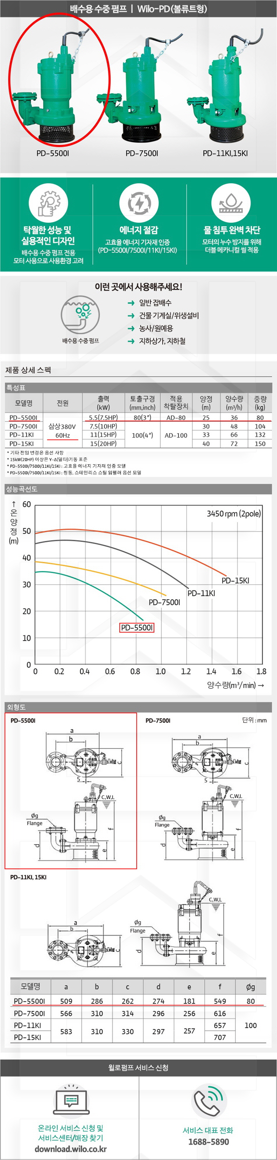 100-54-15-00005500 배수용수중비자동 삼상380, 잡배수용 PD-5500I 판매가 1,422,000 ~ 원 배송방법 일반배송 브랜드 제조사 윌로펌프 주식회사 상품옵션 품명 옵션코드 규격 중량 판매단위 회원가 수량 PD-1505I 100-54-15-00001505 50A 30.0kg (30,000g) 0 656,000원 - + PD-2200I 100-54-15-00002200 80A 50.0kg (50,000g) 0 766,000원 - + PD-3701I 100-54-15-00003701 80A 68.0kg (68,000g) 0 1,075,000원 - + PD-5500I 100-54-15-00005500 80A 80.0kg (80,000g) 0 1,423,000원 - + PD-7500I 100-54-15-00007500 100A 104.0kg (104,000g) 0 1,829,000원 - + PD-11KI 100-54-15-00110000 100A 132.0kg (132,000g) 0 2,594,000원 - + PD-15KI 100-54-15-00150000 100A 150.0kg (150,000g) 0 2,963,000원 - + 총 상품 금액(VAT포함) 원 회원 / 비회원 구매하기 상품담기 제품상세정보 상품문의 (0) 배송 안내 반품/교환 안내 배수용 수중 펌프 볼류트형 상품 문의하기 배송안내 배송 안내 일반제품 당일 1시 이전 주문시 재고 여부에 따라 당일발송 재고 부족시 2~3일 소요 파손위험제품 (화물택배/차량배송) 파손위험이 큰 제품은 빠렛트로 포장되어 차량으로 이동됩니다. 고객님이 지정한 장소와 가장 가까운 차량접근이 가능한 도로까지만 배송 주문물량 및 제품의 특성에 따라 화물, 화물택배. 합짐차량. 단독차량으로 고객님의 요청에 따라 운송 차량 지정 제품 하차시 파손이 있을 수 있으므로, 꼭 하차전 제품을 확인 고객센터 고객 센터 010-6539-7900 상담시간 오전 09시 ~ 오후 6시 점심 : 12:00 ~ 13:00 / 휴일 : 토, 일요일, 공휴일 반품/교환 안내 제품의 하자 및 오배송은 문의 주시면 즉시 처리해드리겠습니다. 반품/교환 판매자 지정택배사 : CJ대한통운 반품배송비(편도) : 3,000원 교환배송비(왕복) : 6,000원 보내실 곳 : 전라북도 전주시 완산구 콩쥐팥쥐로 1570 * 반품/교환 사유에 따른 요청 가능 기간 구매자 단순 변심 : 상품수령후 7일이내(구매자 반품 배송비 부담) 반품/교환 불가능 사유 교환/반품 요청 기간이 지난 경우 소비자의 책임 있는 사유로 상품 등이 분실/파손/훼손된 경우 소비자의 사용/소비에 의해 상품 등의 가치가 현저히 감소한 경우 제품을 설치 또는 장착하였을 경우 주문제작 상품중 상품제작에 들어간 경우 제품을 하차 또는 시공 후의 공정과정에서 일어난 파손의 경우 교환 반품시 고객 부담 배송비를 지불하지 아니한 경우 * 펌프제품은 미사용, 포장박스 미훼손 시에만 교환/반품이 가능합니다. 고객센터 고객 센터 010-6539-7900 상담시간 오전 09시 ~ 오후 6시 점심 : 12:00 ~ 13:00 / 휴일 : 토, 일요일, 공휴일
