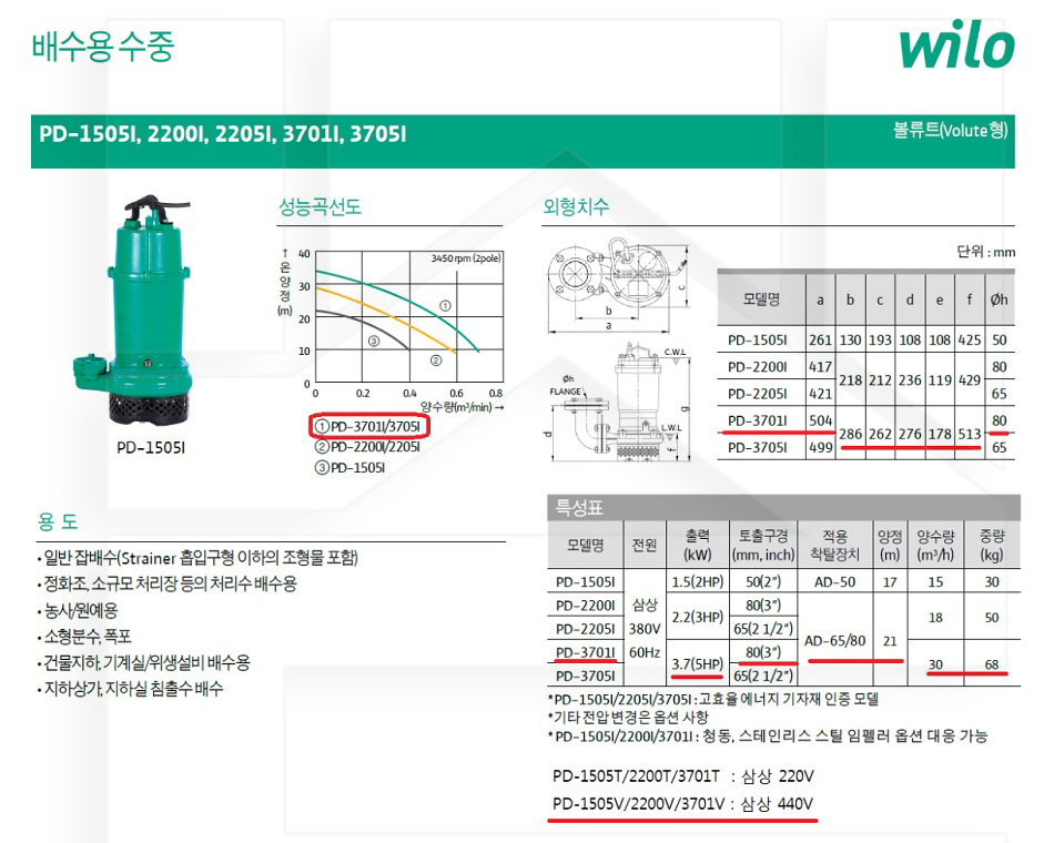 100-54-16-00003701 배수용수중비자동 삼상440, 잡배수용 PD-3701V 판매가 1,075,000 ~ 원 배송방법 일반배송 브랜드 제조사 윌로펌프 주식회사 상품옵션 품명 옵션코드 규격 중량 판매단위 회원가 수량 PD-1505V 100-54-16-00001505 50A 30.0kg (30,000g) 0 656,000원 - + PD-2200V 100-54-16-00002200 80A 50.0kg (50,000g) 0 766,000원 - + PD-3701V 100-54-16-00003701 80A 68.0kg (68,000g) 0 1,075,000원 - + 총 상품 금액(VAT포함) 원 회원 / 비회원 구매하기 상품담기 제품상세정보 상품문의 (0) 배송 안내 반품/교환 안내 배수용 수중 펌프 볼류트형 상품 문의하기 배송안내 배송 안내 일반제품 당일 1시 이전 주문시 재고 여부에 따라 당일발송 재고 부족시 2~3일 소요 파손위험제품 (화물택배/차량배송) 파손위험이 큰 제품은 빠렛트로 포장되어 차량으로 이동됩니다. 고객님이 지정한 장소와 가장 가까운 차량접근이 가능한 도로까지만 배송 주문물량 및 제품의 특성에 따라 화물, 화물택배. 합짐차량. 단독차량으로 고객님의 요청에 따라 운송 차량 지정 제품 하차시 파손이 있을 수 있으므로, 꼭 하차전 제품을 확인 고객센터 고객 센터 010-6539-7900 상담시간 오전 09시 ~ 오후 6시 점심 : 12:00 ~ 13:00 / 휴일 : 토, 일요일, 공휴일 반품/교환 안내 제품의 하자 및 오배송은 문의 주시면 즉시 처리해드리겠습니다. 반품/교환 판매자 지정택배사 : CJ대한통운 반품배송비(편도) : 3,000원 교환배송비(왕복) : 6,000원 보내실 곳 : 전라북도 전주시 완산구 콩쥐팥쥐로 1570 * 반품/교환 사유에 따른 요청 가능 기간 구매자 단순 변심 : 상품수령후 7일이내(구매자 반품 배송비 부담) 반품/교환 불가능 사유 교환/반품 요청 기간이 지난 경우 소비자의 책임 있는 사유로 상품 등이 분실/파손/훼손된 경우 소비자의 사용/소비에 의해 상품 등의 가치가 현저히 감소한 경우 제품을 설치 또는 장착하였을 경우 주문제작 상품중 상품제작에 들어간 경우 제품을 하차 또는 시공 후의 공정과정에서 일어난 파손의 경우 교환 반품시 고객 부담 배송비를 지불하지 아니한 경우 * 펌프제품은 미사용, 포장박스 미훼손 시에만 교환/반품이 가능합니다. 고객센터 고객 센터 010-6539-7900 상담시간 오전 09시 ~ 오후 6시 점심 : 12:00 ~ 13:00 / 휴일 : 토, 일요일, 공휴일