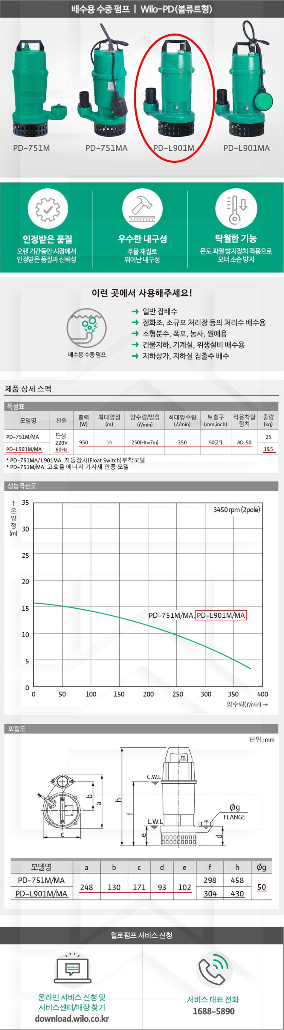 100-55-12-00000901 배수용수중비자동, 보급형 PD-L901M 판매가 328,000 ~ 원 배송방법 일반배송 브랜드 제조사 윌로펌프 주식회사 상품옵션 품명 옵션코드 규격 중량 판매단위 회원가 수량 PD-L401M 100-55-12-00000401 50A 19.0kg (19,000g) 0 270,000원 - + PD-L901M 100-55-12-00000901 50A 25.0kg (25,000g) 0 328,000원 - + 총 상품 금액(VAT포함) 원 회원 / 비회원 구매하기 상품담기 제품상세정보 상품문의 (0) 배송 안내 반품/교환 안내 배수용 수중 펌프 볼류트형 상품 문의하기 배송안내 배송 안내 일반제품 당일 1시 이전 주문시 재고 여부에 따라 당일발송 재고 부족시 2~3일 소요 파손위험제품 (화물택배/차량배송) 파손위험이 큰 제품은 빠렛트로 포장되어 차량으로 이동됩니다. 고객님이 지정한 장소와 가장 가까운 차량접근이 가능한 도로까지만 배송 주문물량 및 제품의 특성에 따라 화물, 화물택배. 합짐차량. 단독차량으로 고객님의 요청에 따라 운송 차량 지정 제품 하차시 파손이 있을 수 있으므로, 꼭 하차전 제품을 확인 고객센터 고객 센터 010-6539-7900 상담시간 오전 09시 ~ 오후 6시 점심 : 12:00 ~ 13:00 / 휴일 : 토, 일요일, 공휴일 반품/교환 안내 제품의 하자 및 오배송은 문의 주시면 즉시 처리해드리겠습니다. 반품/교환 판매자 지정택배사 : CJ대한통운 반품배송비(편도) : 3,000원 교환배송비(왕복) : 6,000원 보내실 곳 : 전라북도 전주시 완산구 콩쥐팥쥐로 1570 * 반품/교환 사유에 따른 요청 가능 기간 구매자 단순 변심 : 상품수령후 7일이내(구매자 반품 배송비 부담) 반품/교환 불가능 사유 교환/반품 요청 기간이 지난 경우 소비자의 책임 있는 사유로 상품 등이 분실/파손/훼손된 경우 소비자의 사용/소비에 의해 상품 등의 가치가 현저히 감소한 경우 제품을 설치 또는 장착하였을 경우 주문제작 상품중 상품제작에 들어간 경우 제품을 하차 또는 시공 후의 공정과정에서 일어난 파손의 경우 교환 반품시 고객 부담 배송비를 지불하지 아니한 경우 * 펌프제품은 미사용, 포장박스 미훼손 시에만 교환/반품이 가능합니다. 고객센터 고객 센터 010-6539-7900 상담시간 오전 09시 ~ 오후 6시 점심 : 12:00 ~ 13:00 / 휴일 : 토, 일요일, 공휴일