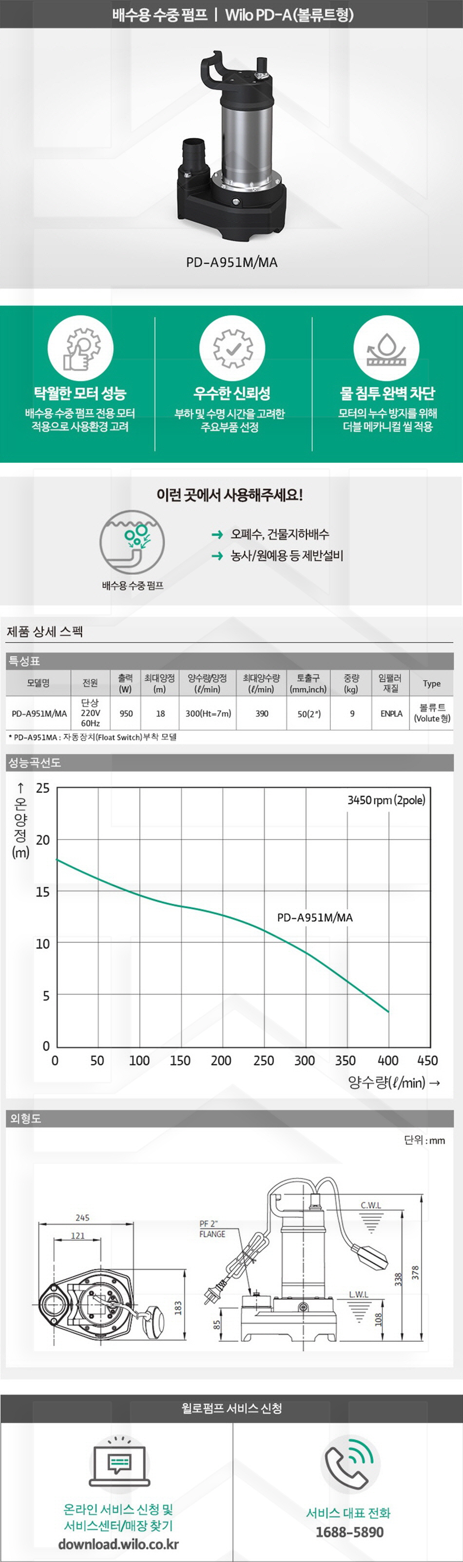 100-56-13-00000951 배수용수중비자동, 알미늄 PD-A951M 판매가 381,000 ~ 원 배송방법 일반배송 브랜드 제조사 윌로펌프 주식회사 상품옵션 품명 옵션코드 규격 중량 판매단위 회원가 수량 PD-A601M 100-56-13-00000601 50A 9.0kg (9,000g) 0 301,000원 - + PD-A951M 100-56-13-00000951 50A 9.0kg (9,000g) 0 381,000원 - + 총 상품 금액(VAT포함) 원 회원 / 비회원 구매하기 상품담기 제품상세정보 상품문의 (0) 배송 안내 반품/교환 안내 배수용 수중 펌프 볼류트형 상품 문의하기 배송안내 배송 안내 일반제품 당일 1시 이전 주문시 재고 여부에 따라 당일발송 재고 부족시 2~3일 소요 파손위험제품 (화물택배/차량배송) 파손위험이 큰 제품은 빠렛트로 포장되어 차량으로 이동됩니다. 고객님이 지정한 장소와 가장 가까운 차량접근이 가능한 도로까지만 배송 주문물량 및 제품의 특성에 따라 화물, 화물택배. 합짐차량. 단독차량으로 고객님의 요청에 따라 운송 차량 지정 제품 하차시 파손이 있을 수 있으므로, 꼭 하차전 제품을 확인 고객센터 고객 센터 010-6539-7900 상담시간 오전 09시 ~ 오후 6시 점심 : 12:00 ~ 13:00 / 휴일 : 토, 일요일, 공휴일 반품/교환 안내 제품의 하자 및 오배송은 문의 주시면 즉시 처리해드리겠습니다. 반품/교환 판매자 지정택배사 : CJ대한통운 반품배송비(편도) : 3,000원 교환배송비(왕복) : 6,000원 보내실 곳 : 전라북도 전주시 완산구 콩쥐팥쥐로 1570 * 반품/교환 사유에 따른 요청 가능 기간 구매자 단순 변심 : 상품수령후 7일이내(구매자 반품 배송비 부담) 반품/교환 불가능 사유 교환/반품 요청 기간이 지난 경우 소비자의 책임 있는 사유로 상품 등이 분실/파손/훼손된 경우 소비자의 사용/소비에 의해 상품 등의 가치가 현저히 감소한 경우 제품을 설치 또는 장착하였을 경우 주문제작 상품중 상품제작에 들어간 경우 제품을 하차 또는 시공 후의 공정과정에서 일어난 파손의 경우 교환 반품시 고객 부담 배송비를 지불하지 아니한 경우 * 펌프제품은 미사용, 포장박스 미훼손 시에만 교환/반품이 가능합니다. 고객센터 고객 센터 010-6539-7900 상담시간 오전 09시 ~ 오후 6시 점심 : 12:00 ~ 13:00 / 휴일 : 토, 일요일, 공휴일