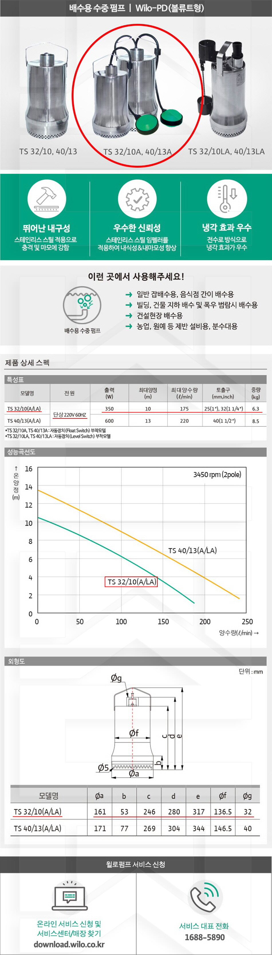 100-59-11-00003210 배수용수중자동, 올스텐 TS32/10A 판매가 291,000 ~ 원 배송방법 일반배송 브랜드 제조사 윌로펌프 주식회사 상품옵션 품명 옵션코드 규격 중량 판매단위 회원가 수량 TS32/10A 100-59-11-00003210 32/25A 6.3kg (6,300g) 0 291,000원 - + TS40/13A 100-59-11-00004013 40A 8.5kg (8,500g) 0 394,000원 - + 총 상품 금액(VAT포함) 원 회원 / 비회원 구매하기 상품담기 제품상세정보 상품문의 (0) 배송 안내 반품/교환 안내 배수용 수중 펌프 볼류트형 상품 문의하기 배송안내 배송 안내 일반제품 당일 1시 이전 주문시 재고 여부에 따라 당일발송 재고 부족시 2~3일 소요 파손위험제품 (화물택배/차량배송) 파손위험이 큰 제품은 빠렛트로 포장되어 차량으로 이동됩니다. 고객님이 지정한 장소와 가장 가까운 차량접근이 가능한 도로까지만 배송 주문물량 및 제품의 특성에 따라 화물, 화물택배. 합짐차량. 단독차량으로 고객님의 요청에 따라 운송 차량 지정 제품 하차시 파손이 있을 수 있으므로, 꼭 하차전 제품을 확인 고객센터 고객 센터 010-6539-7900 상담시간 오전 09시 ~ 오후 6시 점심 : 12:00 ~ 13:00 / 휴일 : 토, 일요일, 공휴일 반품/교환 안내 제품의 하자 및 오배송은 문의 주시면 즉시 처리해드리겠습니다. 반품/교환 판매자 지정택배사 : CJ대한통운 반품배송비(편도) : 3,000원 교환배송비(왕복) : 6,000원 보내실 곳 : 전라북도 전주시 완산구 콩쥐팥쥐로 1570 * 반품/교환 사유에 따른 요청 가능 기간 구매자 단순 변심 : 상품수령후 7일이내(구매자 반품 배송비 부담) 반품/교환 불가능 사유 교환/반품 요청 기간이 지난 경우 소비자의 책임 있는 사유로 상품 등이 분실/파손/훼손된 경우 소비자의 사용/소비에 의해 상품 등의 가치가 현저히 감소한 경우 제품을 설치 또는 장착하였을 경우 주문제작 상품중 상품제작에 들어간 경우 제품을 하차 또는 시공 후의 공정과정에서 일어난 파손의 경우 교환 반품시 고객 부담 배송비를 지불하지 아니한 경우 * 펌프제품은 미사용, 포장박스 미훼손 시에만 교환/반품이 가능합니다. 고객센터 고객 센터 010-6539-7900 상담시간 오전 09시 ~ 오후 6시 점심 : 12:00 ~ 13:00 / 휴일 : 토, 일요일, 공휴일