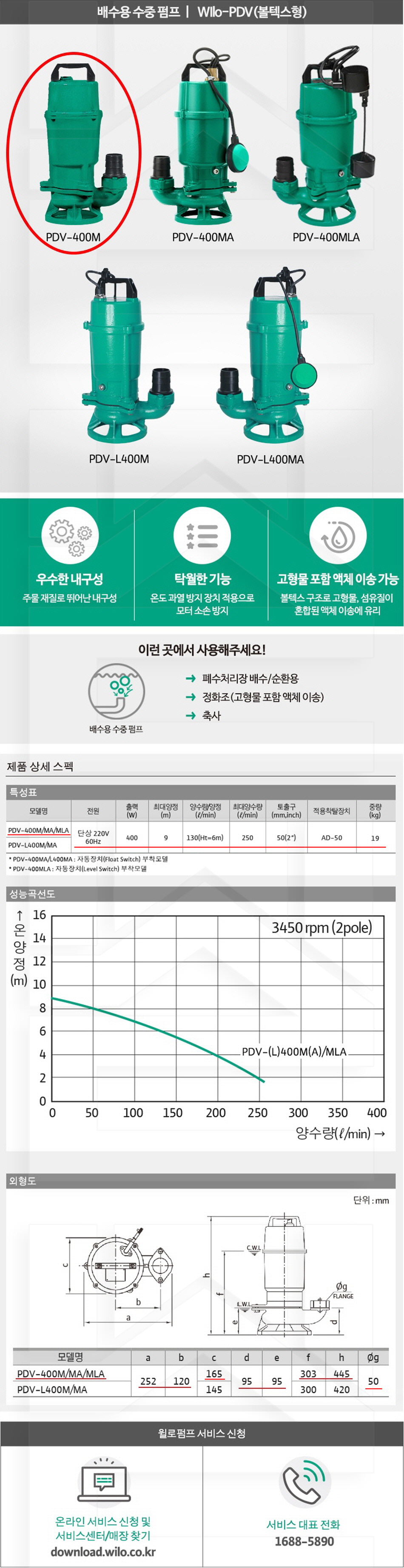 100-62-13-00000400 오수비자동 PDV-400M 판매가 323,000 ~ 원 배송방법 일반배송 브랜드 제조사 윌로펌프 주식회사 상품옵션 품명 옵션코드 규격 중량 판매단위 회원가 수량 PDV-300M 100-62-13-00000300 32A 13.0kg (13,000g) 0 207,000원 - + PDV-400M 100-62-13-00000400 50A 19.0kg (19,000g) 0 323,000원 - + PDV-750M, PDV-950M 100-62-13-00000750 50A 24.0kg (24,000g) 0 393,000원 - + PDV-753M 청동임펠러 100-62-13-00000753 50A 24.0kg (24,000g) 0 409,000원 - + PDV-754M 스텐임펠러 100-62-13-00000754 50A 24.0kg (24,000g) 0 464,000원 - + 총 상품 금액(VAT포함) 원 회원 / 비회원 구매하기 상품담기 제품상세정보 상품문의 (0) 배송 안내 반품/교환 안내 배수용 수중 펌프 볼텍스형 상품 문의하기 배송안내 배송 안내 일반제품 당일 1시 이전 주문시 재고 여부에 따라 당일발송 재고 부족시 2~3일 소요 파손위험제품 (화물택배/차량배송) 파손위험이 큰 제품은 빠렛트로 포장되어 차량으로 이동됩니다. 고객님이 지정한 장소와 가장 가까운 차량접근이 가능한 도로까지만 배송 주문물량 및 제품의 특성에 따라 화물, 화물택배. 합짐차량. 단독차량으로 고객님의 요청에 따라 운송 차량 지정 제품 하차시 파손이 있을 수 있으므로, 꼭 하차전 제품을 확인 고객센터 고객 센터 010-6539-7900 상담시간 오전 09시 ~ 오후 6시 점심 : 12:00 ~ 13:00 / 휴일 : 토, 일요일, 공휴일 반품/교환 안내 제품의 하자 및 오배송은 문의 주시면 즉시 처리해드리겠습니다. 반품/교환 판매자 지정택배사 : CJ대한통운 반품배송비(편도) : 3,000원 교환배송비(왕복) : 6,000원 보내실 곳 : 전라북도 전주시 완산구 콩쥐팥쥐로 1570 * 반품/교환 사유에 따른 요청 가능 기간 구매자 단순 변심 : 상품수령후 7일이내(구매자 반품 배송비 부담) 반품/교환 불가능 사유 교환/반품 요청 기간이 지난 경우 소비자의 책임 있는 사유로 상품 등이 분실/파손/훼손된 경우 소비자의 사용/소비에 의해 상품 등의 가치가 현저히 감소한 경우 제품을 설치 또는 장착하였을 경우 주문제작 상품중 상품제작에 들어간 경우 제품을 하차 또는 시공 후의 공정과정에서 일어난 파손의 경우 교환 반품시 고객 부담 배송비를 지불하지 아니한 경우 * 펌프제품은 미사용, 포장박스 미훼손 시에만 교환/반품이 가능합니다. 고객센터 고객 센터 010-6539-7900 상담시간 오전 09시 ~ 오후 6시 점심 : 12:00 ~ 13:00 / 휴일 : 토, 일요일, 공휴일