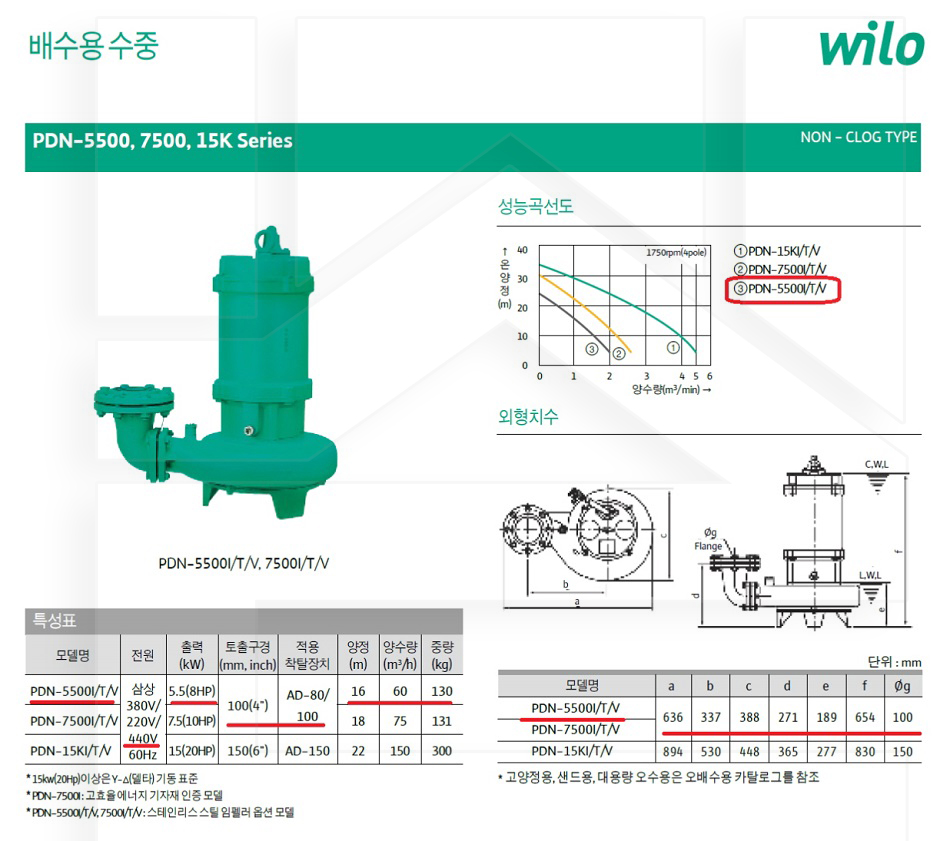 100-65-15-00005500 오수비자동 삼상440 PDN-5500V 판매가 1,902,000 ~ 원 배송방법 일반배송 브랜드 제조사 윌로펌프 주식회사 상품옵션 품명 옵션코드 규격 중량 판매단위 회원가 수량 PDN-2200V 100-65-15-00002200 80A 50.0kg (50,000g) 0 698,000원 - + PDN-2500V 100-65-15-00002500 80A 55.0kg (55,000g) 0 765,000원 - + PDN-5500V 100-65-15-00005500 100A 130.0kg (130,000g) 0 1,902,000원 - + PDN-7500V 100-65-15-00007500 100A 131.0kg (131,000g) 0 2,054,000원 - + 총 상품 금액(VAT포함) 원 회원 / 비회원 구매하기 상품담기 제품상세정보 상품문의 (0) 배송 안내 반품/교환 안내 배수용 수중 펌프 논클로그형 상품 문의하기 배송안내 배송 안내 일반제품 당일 1시 이전 주문시 재고 여부에 따라 당일발송 재고 부족시 2~3일 소요 파손위험제품 (화물택배/차량배송) 파손위험이 큰 제품은 빠렛트로 포장되어 차량으로 이동됩니다. 고객님이 지정한 장소와 가장 가까운 차량접근이 가능한 도로까지만 배송 주문물량 및 제품의 특성에 따라 화물, 화물택배. 합짐차량. 단독차량으로 고객님의 요청에 따라 운송 차량 지정 제품 하차시 파손이 있을 수 있으므로, 꼭 하차전 제품을 확인 고객센터 고객 센터 010-6539-7900 상담시간 오전 09시 ~ 오후 6시 점심 : 12:00 ~ 13:00 / 휴일 : 토, 일요일, 공휴일 반품/교환 안내 제품의 하자 및 오배송은 문의 주시면 즉시 처리해드리겠습니다. 반품/교환 판매자 지정택배사 : CJ대한통운 반품배송비(편도) : 3,000원 교환배송비(왕복) : 6,000원 보내실 곳 : 전라북도 전주시 완산구 콩쥐팥쥐로 1570 * 반품/교환 사유에 따른 요청 가능 기간 구매자 단순 변심 : 상품수령후 7일이내(구매자 반품 배송비 부담) 반품/교환 불가능 사유 교환/반품 요청 기간이 지난 경우 소비자의 책임 있는 사유로 상품 등이 분실/파손/훼손된 경우 소비자의 사용/소비에 의해 상품 등의 가치가 현저히 감소한 경우 제품을 설치 또는 장착하였을 경우 주문제작 상품중 상품제작에 들어간 경우 제품을 하차 또는 시공 후의 공정과정에서 일어난 파손의 경우 교환 반품시 고객 부담 배송비를 지불하지 아니한 경우 * 펌프제품은 미사용, 포장박스 미훼손 시에만 교환/반품이 가능합니다. 고객센터 고객 센터 010-6539-7900 상담시간 오전 09시 ~ 오후 6시 점심 : 12:00 ~ 13:00 / 휴일 : 토, 일요일, 공휴일