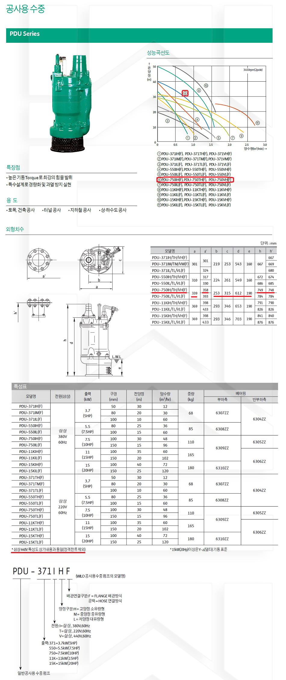100-71-14-00000750 공사용수중 삼상440플랜지 고양정소유량 PDU-750VHF 판매가 2,022,000 ~ 원 배송방법 일반배송 브랜드 제조사 윌로펌프 주식회사 상품옵션 품명 옵션코드 규격 중량 판매단위 회원가 수량 PDU-371VHF 100-71-14-00000371 50A 68.0kg (68,000g) 0 1,204,000원 - + PDU-750VHF 100-71-14-00000750 100A 110.0kg (110,000g) 0 2,022,000원 - + PDU-11KVHF 100-71-14-00110000 100A 165.0kg (165,000g) 0 2,672,000원 - + PDU-15KVHF 100-71-14-00150000 100A 180.0kg (180,000g) 0 3,176,000원 - + 총 상품 금액(VAT포함) 원 회원 / 비회원 구매하기 상품담기 제품상세정보 상품문의 (0) 배송 안내 반품/교환 안내 공사용 수중 펌프 상품 문의하기 배송안내 배송 안내 일반제품 당일 1시 이전 주문시 재고 여부에 따라 당일발송 재고 부족시 2~3일 소요 파손위험제품 (화물택배/차량배송) 파손위험이 큰 제품은 빠렛트로 포장되어 차량으로 이동됩니다. 고객님이 지정한 장소와 가장 가까운 차량접근이 가능한 도로까지만 배송 주문물량 및 제품의 특성에 따라 화물, 화물택배. 합짐차량. 단독차량으로 고객님의 요청에 따라 운송 차량 지정 제품 하차시 파손이 있을 수 있으므로, 꼭 하차전 제품을 확인 고객센터 고객 센터 010-6539-7900 상담시간 오전 09시 ~ 오후 6시 점심 : 12:00 ~ 13:00 / 휴일 : 토, 일요일, 공휴일 반품/교환 안내 제품의 하자 및 오배송은 문의 주시면 즉시 처리해드리겠습니다. 반품/교환 판매자 지정택배사 : CJ대한통운 반품배송비(편도) : 3,000원 교환배송비(왕복) : 6,000원 보내실 곳 : 전라북도 전주시 완산구 콩쥐팥쥐로 1570 * 반품/교환 사유에 따른 요청 가능 기간 구매자 단순 변심 : 상품수령후 7일이내(구매자 반품 배송비 부담) 반품/교환 불가능 사유 교환/반품 요청 기간이 지난 경우 소비자의 책임 있는 사유로 상품 등이 분실/파손/훼손된 경우 소비자의 사용/소비에 의해 상품 등의 가치가 현저히 감소한 경우 제품을 설치 또는 장착하였을 경우 주문제작 상품중 상품제작에 들어간 경우 제품을 하차 또는 시공 후의 공정과정에서 일어난 파손의 경우 교환 반품시 고객 부담 배송비를 지불하지 아니한 경우 * 펌프제품은 미사용, 포장박스 미훼손 시에만 교환/반품이 가능합니다. 고객센터 고객 센터 010-6539-7900 상담시간 오전 09시 ~ 오후 6시 점심 : 12:00 ~ 13:00 / 휴일 : 토, 일요일, 공휴일