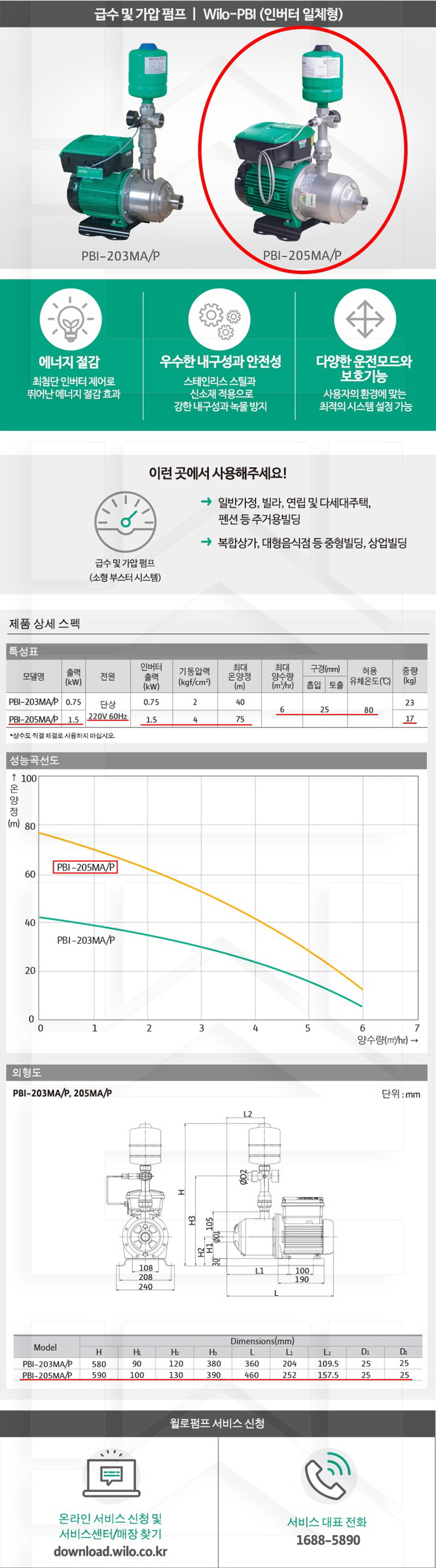 101-32-11-00000205 인버터 일체형펌프 PBI시리즈 PBI-205MA/P(1.1W) 판매가 1,430,000 ~ 원 배송방법 일반배송 브랜드 제조사 윌로펌프 주식회사 상품옵션 품명 옵션코드 규격 중량 판매단위 회원가 수량 PBI-203MA/P(0.75W) 101-32-11-00000203 25A 23.0kg (23,000g) 0 1,331,000원 - + PBI-205MA/P(1.1W) 101-32-11-00000205 25A 17.0kg (17,000g) 0 1,430,000원 - + PBI-402MA/P(0.75W) 101-32-11-00000402 32/25A 22.0kg (22,000g) 0 1,331,000원 - + PBI-403MA/P(1.1W) 101-32-11-00000403 32/25A 24.0kg (24,000g) 0 1,430,000원 - + PBI-404MA/P(1.5W) 101-32-11-00000404 32/25A 26.0kg (26,000g) 0 1,510,000원 - + PBI-405MA/P(1.85W) 101-32-11-00000405 32/25A 27.0kg (27,000g) 0 1,787,000원 - + PBI-406UA/P(2.2W) 101-32-11-00000406 32/25A 29.0kg (29,000g) 0 2,436,000원 - + PBI-802MA/P(1.5W) 101-32-11-00000802 40/32A 27.0kg (27,000g) 0 1,701,000원 - + PBI-803MA/P(1.85W) 101-32-11-00000803 40/32A 29.0kg (29,000g) 0 1,933,000원 - + PBI-804UA/P(2.5W) 101-32-11-00000804 40/32A 31.0kg (31,000g) 0 2,436,000원 - + 총 상품 금액(VAT포함) 원 회원 / 비회원 구매하기 상품담기 제품상세정보 상품문의 (0) 배송 안내 반품/교환 안내 급수 가압펌프 인버터 일체형 상품 문의하기 배송안내 배송 안내 일반제품 당일 1시 이전 주문시 재고 여부에 따라 당일발송 재고 부족시 2~3일 소요 파손위험제품 (화물택배/차량배송) 파손위험이 큰 제품은 빠렛트로 포장되어 차량으로 이동됩니다. 고객님이 지정한 장소와 가장 가까운 차량접근이 가능한 도로까지만 배송 주문물량 및 제품의 특성에 따라 화물, 화물택배. 합짐차량. 단독차량으로 고객님의 요청에 따라 운송 차량 지정 제품 하차시 파손이 있을 수 있으므로, 꼭 하차전 제품을 확인 고객센터 고객 센터 010-6539-7900 상담시간 오전 09시 ~ 오후 6시 점심 : 12:00 ~ 13:00 / 휴일 : 토, 일요일, 공휴일 반품/교환 안내 제품의 하자 및 오배송은 문의 주시면 즉시 처리해드리겠습니다. 반품/교환 판매자 지정택배사 : CJ대한통운 반품배송비(편도) : 3,000원 교환배송비(왕복) : 6,000원 보내실 곳 : 전라북도 전주시 완산구 콩쥐팥쥐로 1570 * 반품/교환 사유에 따른 요청 가능 기간 구매자 단순 변심 : 상품수령후 7일이내(구매자 반품 배송비 부담) 반품/교환 불가능 사유 교환/반품 요청 기간이 지난 경우 소비자의 책임 있는 사유로 상품 등이 분실/파손/훼손된 경우 소비자의 사용/소비에 의해 상품 등의 가치가 현저히 감소한 경우 제품을 설치 또는 장착하였을 경우 주문제작 상품중 상품제작에 들어간 경우 제품을 하차 또는 시공 후의 공정과정에서 일어난 파손의 경우 교환 반품시 고객 부담 배송비를 지불하지 아니한 경우 * 펌프제품은 미사용, 포장박스 미훼손 시에만 교환/반품이 가능합니다. 고객센터 고객 센터 010-6539-7900 상담시간 오전 09시 ~ 오후 6시 점심 : 12:00 ~ 13:00 / 휴일 : 토, 일요일, 공휴일