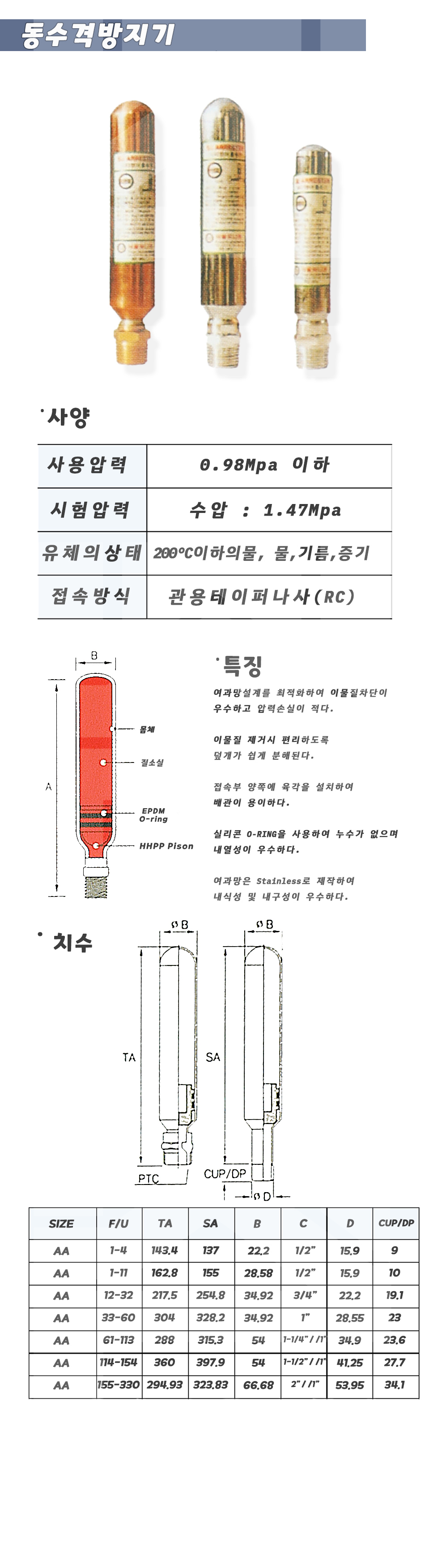 001-38-01-00000040 동 수격방지기 워터햄머 판매가 123,645 ~ 원 배송방법 일반배송 브랜드 제조사 상품옵션 품명 옵션코드 규격 중량 판매단위 회원가 수량 동 수격방지기 워터햄머 001-38-01-00000015 15A 0.2kg (178g) 0 18,133원 - + 동 수격방지기 워터햄머 001-38-01-00000020 20A 0.3kg (268g) 0 34,171원 - + 동 수격방지기 워터햄머 001-38-01-00000025 25A 0.4kg (380g) 0 65,303원 - + 동 수격방지기 워터햄머 001-38-01-00000032 32A 0.7kg (720g) 0 96,436원 - + 동 수격방지기 워터햄머 001-38-01-00000040 40A 0.9kg (902g) 0 123,645원 - + 동 수격방지기 워터햄머 001-38-01-00000050 50A 1.2kg (1,176g) 0 195,891원 - + 총 상품 금액(VAT포함) 원 회원 / 비회원 구매하기 상품담기 제품상세정보 상품문의 (0) 배송 안내 반품/교환 안내 동 수격방지기 상품 문의하기 배송안내 배송 안내 일반제품 당일 1시 이전 주문시 재고 여부에 따라 당일발송 재고 부족시 2~3일 소요 파손위험제품 (화물택배/차량배송) 파손위험이 큰 제품은 빠렛트로 포장되어 차량으로 이동됩니다. 고객님이 지정한 장소와 가장 가까운 차량접근이 가능한 도로까지만 배송 주문물량 및 제품의 특성에 따라 화물, 화물택배. 합짐차량. 단독차량으로 고객님의 요청에 따라 운송 차량 지정 제품 하차시 파손이 있을 수 있으므로, 꼭 하차전 제품을 확인 고객센터 고객 센터 010-6539-7900 상담시간 오전 09시 ~ 오후 6시 점심 : 12:00 ~ 13:00 / 휴일 : 토, 일요일, 공휴일 반품/교환 안내 제품의 하자 및 오배송은 문의 주시면 즉시 처리해드리겠습니다. 반품/교환 판매자 지정택배사 : CJ대한통운 반품배송비(편도) : 3,000원 교환배송비(왕복) : 6,000원 보내실 곳 : 전라북도 전주시 완산구 콩쥐팥쥐로 1570 * 반품/교환 사유에 따른 요청 가능 기간 구매자 단순 변심 : 상품수령후 7일이내(구매자 반품 배송비 부담) 반품/교환 불가능 사유 교환/반품 요청 기간이 지난 경우 소비자의 책임 있는 사유로 상품 등이 분실/파손/훼손된 경우 소비자의 사용/소비에 의해 상품 등의 가치가 현저히 감소한 경우 제품을 설치 또는 장착하였을 경우 주문제작 상품중 상품제작에 들어간 경우 제품을 하차 또는 시공 후의 공정과정에서 일어난 파손의 경우 교환 반품시 고객 부담 배송비를 지불하지 아니한 경우 * 펌프제품은 미사용, 포장박스 미훼손 시에만 교환/반품이 가능합니다. 고객센터 고객 센터 010-6539-7900 상담시간 오전 09시 ~ 오후 6시 점심 : 12:00 ~ 13:00 / 휴일 : 토, 일요일, 공휴일