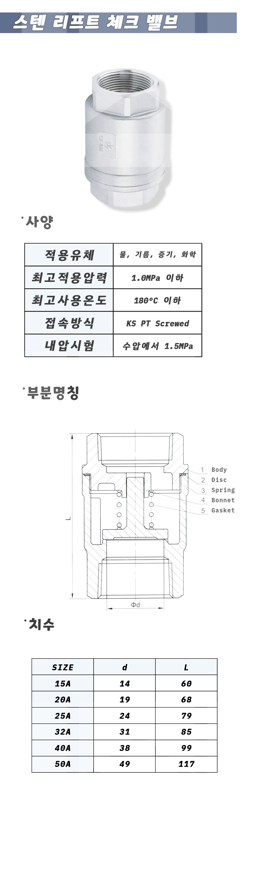 002-32-03-00000015 스텐 체크밸브 압상 판매가 25,600 ~ 원 배송방법 일반배송 브랜드 제조사 상품옵션 품명 옵션코드 규격 중량 판매단위 회원가 수량 스텐 체크밸브 압상 002-32-03-00000015 15A 0.2kg (240g) 0 25,600원 - + 스텐 체크밸브 압상 002-32-03-00000020 20A 0.3kg (280g) 0 28,800원 - + 스텐 체크밸브 압상 002-32-03-00000025 25A 0.4kg (400g) 0 33,600원 - + 스텐 체크밸브 압상 002-32-03-00000032 32A 0.7kg (660g) 0 44,000원 - + 스텐 체크밸브 압상 002-32-03-00000040 40A 0.8kg (770g) 0 54,400원 - + 스텐 체크밸브 압상 002-32-03-00000050 50A 0.9kg (870g) 0 76,000원 - + 총 상품 금액(VAT포함) 원 회원 / 비회원 구매하기 상품담기 제품상세정보 상품문의 (0) 배송 안내 반품/교환 안내 스텐 압상체크 밸브 상품 문의하기 배송안내 배송 안내 일반제품 당일 1시 이전 주문시 재고 여부에 따라 당일발송 재고 부족시 2~3일 소요 파손위험제품 (화물택배/차량배송) 파손위험이 큰 제품은 빠렛트로 포장되어 차량으로 이동됩니다. 고객님이 지정한 장소와 가장 가까운 차량접근이 가능한 도로까지만 배송 주문물량 및 제품의 특성에 따라 화물, 화물택배. 합짐차량. 단독차량으로 고객님의 요청에 따라 운송 차량 지정 제품 하차시 파손이 있을 수 있으므로, 꼭 하차전 제품을 확인 고객센터 고객 센터 010-6539-7900 상담시간 오전 09시 ~ 오후 6시 점심 : 12:00 ~ 13:00 / 휴일 : 토, 일요일, 공휴일 반품/교환 안내 제품의 하자 및 오배송은 문의 주시면 즉시 처리해드리겠습니다. 반품/교환 판매자 지정택배사 : CJ대한통운 반품배송비(편도) : 3,000원 교환배송비(왕복) : 6,000원 보내실 곳 : 전라북도 전주시 완산구 콩쥐팥쥐로 1570 * 반품/교환 사유에 따른 요청 가능 기간 구매자 단순 변심 : 상품수령후 7일이내(구매자 반품 배송비 부담) 반품/교환 불가능 사유 교환/반품 요청 기간이 지난 경우 소비자의 책임 있는 사유로 상품 등이 분실/파손/훼손된 경우 소비자의 사용/소비에 의해 상품 등의 가치가 현저히 감소한 경우 제품을 설치 또는 장착하였을 경우 주문제작 상품중 상품제작에 들어간 경우 제품을 하차 또는 시공 후의 공정과정에서 일어난 파손의 경우 교환 반품시 고객 부담 배송비를 지불하지 아니한 경우 * 펌프제품은 미사용, 포장박스 미훼손 시에만 교환/반품이 가능합니다. 고객센터 고객 센터 010-6539-7900 상담시간 오전 09시 ~ 오후 6시 점심 : 12:00 ~ 13:00 / 휴일 : 토, 일요일, 공휴일