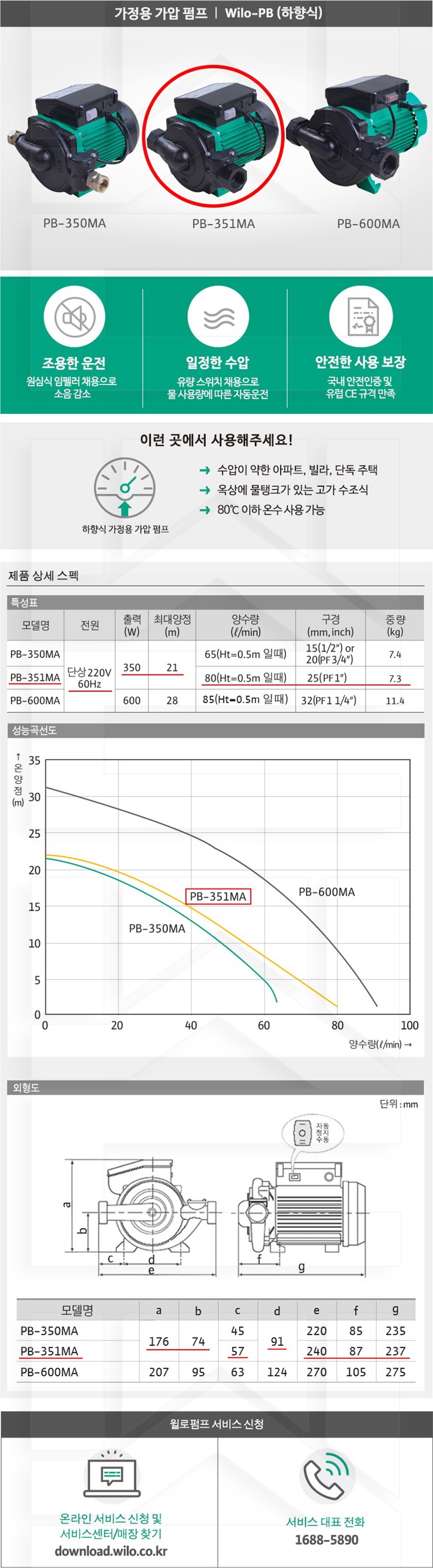 100-11-11-00000351 가압용, 하향식 PB-351MA 판매가 233,000 ~ 원 배송방법 화물배송 브랜드 제조사 윌로펌프 주식회사 상품옵션 품명 옵션코드 규격 중량 판매단위 회원가 수량 PB-350MA 100-11-11-00000350 20A 7.4kg (7,400g) 0 233,000원 - + PB-351MA 100-11-11-00000351 25A 7.3kg (7,300g) 0 233,000원 - + PB-600MA 100-11-11-00000600 32A 11.4kg (11,400g) 0 372,000원 - + 총 상품 금액(VAT포함) 원 회원 / 비회원 구매하기 상품담기 제품상세정보 상품문의 (0) 배송 안내 반품/교환 안내 가정용 가압 펌프 하향식 상품 문의하기 배송안내 배송 안내 일반제품 당일 1시 이전 주문시 재고 여부에 따라 당일발송 재고 부족시 2~3일 소요 파손위험제품 (화물택배/차량배송) 파손위험이 큰 제품은 빠렛트로 포장되어 차량으로 이동됩니다. 고객님이 지정한 장소와 가장 가까운 차량접근이 가능한 도로까지만 배송 주문물량 및 제품의 특성에 따라 화물, 화물택배. 합짐차량. 단독차량으로 고객님의 요청에 따라 운송 차량 지정 제품 하차시 파손이 있을 수 있으므로, 꼭 하차전 제품을 확인 고객센터 고객 센터 010-6539-7900 상담시간 오전 09시 ~ 오후 6시 점심 : 12:00 ~ 13:00 / 휴일 : 토, 일요일, 공휴일 반품/교환 안내 제품의 하자 및 오배송은 문의 주시면 즉시 처리해드리겠습니다. 반품/교환 판매자 지정택배사 : CJ대한통운 반품배송비(편도) : 3,000원 교환배송비(왕복) : 6,000원 보내실 곳 : 전라북도 전주시 완산구 콩쥐팥쥐로 1570 * 반품/교환 사유에 따른 요청 가능 기간 구매자 단순 변심 : 상품수령후 7일이내(구매자 반품 배송비 부담) 반품/교환 불가능 사유 교환/반품 요청 기간이 지난 경우 소비자의 책임 있는 사유로 상품 등이 분실/파손/훼손된 경우 소비자의 사용/소비에 의해 상품 등의 가치가 현저히 감소한 경우 제품을 설치 또는 장착하였을 경우 주문제작 상품중 상품제작에 들어간 경우 제품을 하차 또는 시공 후의 공정과정에서 일어난 파손의 경우 교환 반품시 고객 부담 배송비를 지불하지 아니한 경우 * 펌프제품은 미사용, 포장박스 미훼손 시에만 교환/반품이 가능합니다. 고객센터 고객 센터 010-6539-7900 상담시간 오전 09시 ~ 오후 6시 점심 : 12:00 ~ 13:00 / 휴일 : 토, 일요일, 공휴일
