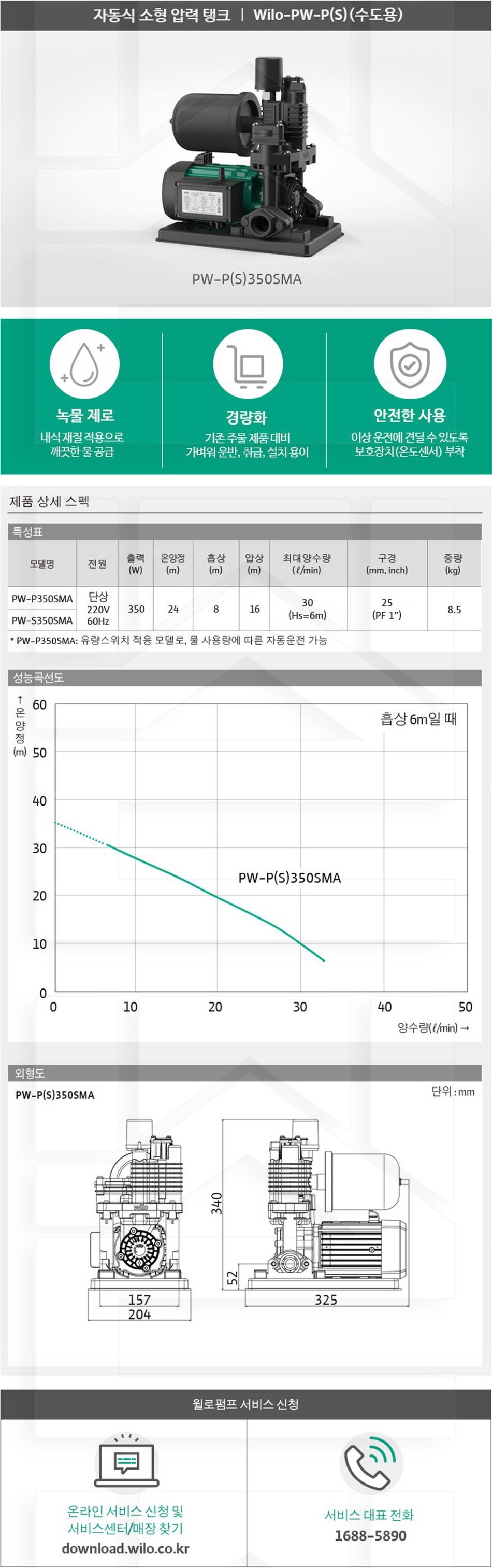 100-12-12-00000350 가정용소형, 자동식소형압력탱크수도용 PW-S350SMA 판매가 277,000 ~ 원 배송방법 일반배송 브랜드 제조사 윌로펌프 주식회사 상품옵션 품명 옵션코드 규격 중량 판매단위 회원가 수량 PW-S350SMA 100-12-12-00000350 25A 8.5kg (8,500g) 0 277,000원 - + PW-S600SMA 100-12-12-00000600 32A 10.0kg (10,000g) 0 314,000원 - + 총 상품 금액(VAT포함) 원 회원 / 비회원 구매하기 상품담기 제품상세정보 상품문의 (0) 배송 안내 반품/교환 안내 자동식 소형 압력 탱크 수도용 상품 문의하기 배송안내 배송 안내 일반제품 당일 1시 이전 주문시 재고 여부에 따라 당일발송 재고 부족시 2~3일 소요 파손위험제품 (화물택배/차량배송) 파손위험이 큰 제품은 빠렛트로 포장되어 차량으로 이동됩니다. 고객님이 지정한 장소와 가장 가까운 차량접근이 가능한 도로까지만 배송 주문물량 및 제품의 특성에 따라 화물, 화물택배. 합짐차량. 단독차량으로 고객님의 요청에 따라 운송 차량 지정 제품 하차시 파손이 있을 수 있으므로, 꼭 하차전 제품을 확인 고객센터 고객 센터 010-6539-7900 상담시간 오전 09시 ~ 오후 6시 점심 : 12:00 ~ 13:00 / 휴일 : 토, 일요일, 공휴일 반품/교환 안내 제품의 하자 및 오배송은 문의 주시면 즉시 처리해드리겠습니다. 반품/교환 판매자 지정택배사 : CJ대한통운 반품배송비(편도) : 3,000원 교환배송비(왕복) : 6,000원 보내실 곳 : 전라북도 전주시 완산구 콩쥐팥쥐로 1570 * 반품/교환 사유에 따른 요청 가능 기간 구매자 단순 변심 : 상품수령후 7일이내(구매자 반품 배송비 부담) 반품/교환 불가능 사유 교환/반품 요청 기간이 지난 경우 소비자의 책임 있는 사유로 상품 등이 분실/파손/훼손된 경우 소비자의 사용/소비에 의해 상품 등의 가치가 현저히 감소한 경우 제품을 설치 또는 장착하였을 경우 주문제작 상품중 상품제작에 들어간 경우 제품을 하차 또는 시공 후의 공정과정에서 일어난 파손의 경우 교환 반품시 고객 부담 배송비를 지불하지 아니한 경우 * 펌프제품은 미사용, 포장박스 미훼손 시에만 교환/반품이 가능합니다. 고객센터 고객 센터 010-6539-7900 상담시간 오전 09시 ~ 오후 6시 점심 : 12:00 ~ 13:00 / 휴일 : 토, 일요일, 공휴일