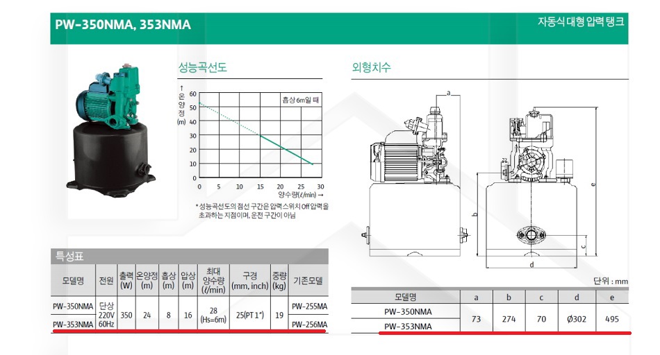100-12-13-00000353 가정용소형, 자동식대형압력탱크 PW-353NMA 판매가 264,000 ~ 원 배송방법 일반배송 브랜드 제조사 윌로펌프 주식회사 상품옵션 품명 옵션코드 규격 중량 판매단위 회원가 수량 PW-350NMA 100-12-13-00000350 25A 19.0kg (19,000g) 0 264,000원 - + PW-353NMA 100-12-13-00000353 32A 19.0kg (19,000g) 0 264,000원 - + 총 상품 금액(VAT포함) 원 회원 / 비회원 구매하기 상품담기 제품상세정보 상품문의 (0) 배송 안내 반품/교환 안내 자동식 대형 압력 탱크 상품 문의하기 배송안내 배송 안내 일반제품 당일 1시 이전 주문시 재고 여부에 따라 당일발송 재고 부족시 2~3일 소요 파손위험제품 (화물택배/차량배송) 파손위험이 큰 제품은 빠렛트로 포장되어 차량으로 이동됩니다. 고객님이 지정한 장소와 가장 가까운 차량접근이 가능한 도로까지만 배송 주문물량 및 제품의 특성에 따라 화물, 화물택배. 합짐차량. 단독차량으로 고객님의 요청에 따라 운송 차량 지정 제품 하차시 파손이 있을 수 있으므로, 꼭 하차전 제품을 확인 고객센터 고객 센터 010-6539-7900 상담시간 오전 09시 ~ 오후 6시 점심 : 12:00 ~ 13:00 / 휴일 : 토, 일요일, 공휴일 반품/교환 안내 제품의 하자 및 오배송은 문의 주시면 즉시 처리해드리겠습니다. 반품/교환 판매자 지정택배사 : CJ대한통운 반품배송비(편도) : 3,000원 교환배송비(왕복) : 6,000원 보내실 곳 : 전라북도 전주시 완산구 콩쥐팥쥐로 1570 * 반품/교환 사유에 따른 요청 가능 기간 구매자 단순 변심 : 상품수령후 7일이내(구매자 반품 배송비 부담) 반품/교환 불가능 사유 교환/반품 요청 기간이 지난 경우 소비자의 책임 있는 사유로 상품 등이 분실/파손/훼손된 경우 소비자의 사용/소비에 의해 상품 등의 가치가 현저히 감소한 경우 제품을 설치 또는 장착하였을 경우 주문제작 상품중 상품제작에 들어간 경우 제품을 하차 또는 시공 후의 공정과정에서 일어난 파손의 경우 교환 반품시 고객 부담 배송비를 지불하지 아니한 경우 * 펌프제품은 미사용, 포장박스 미훼손 시에만 교환/반품이 가능합니다. 고객센터 고객 센터 010-6539-7900 상담시간 오전 09시 ~ 오후 6시 점심 : 12:00 ~ 13:00 / 휴일 : 토, 일요일, 공휴일