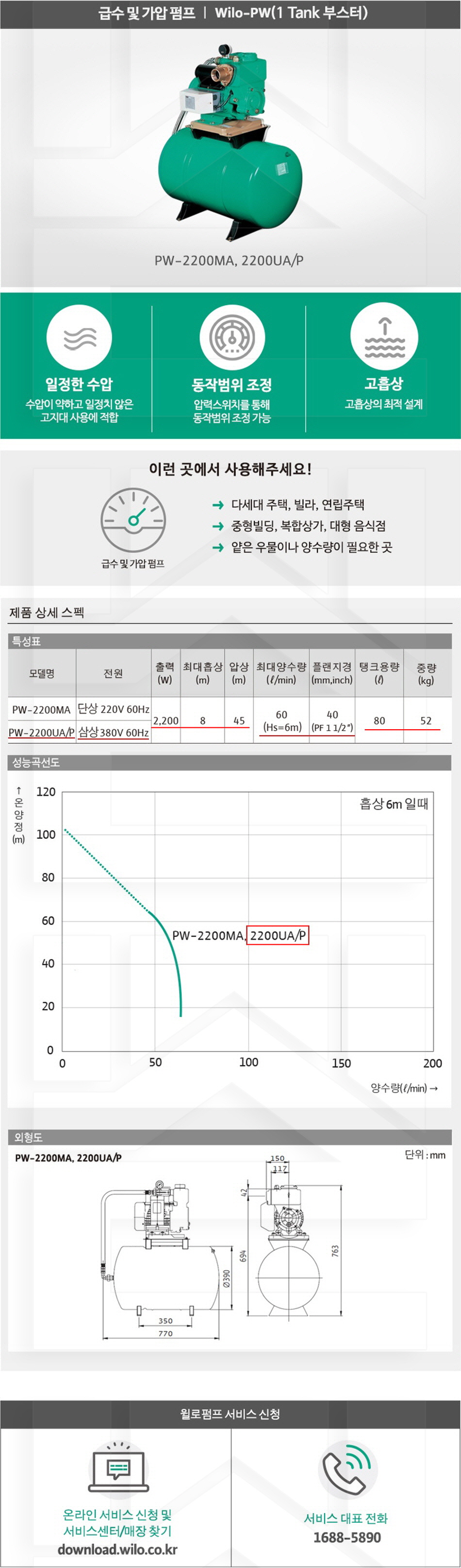 100-13-13-00002200 가압용 1tank 부스터, 고양정형, 삼상 PW-2200UA/P 판매가 1,441,000 원 배송방법 일반배송 브랜드 제조사 윌로펌프 주식회사 상품옵션 품명 옵션코드 규격 중량 판매단위 회원가 수량 PW-2200UA/P 100-13-13-00002200 40A 52.0kg (52,000g) 0 1,441,000원 - + 총 상품 금액(VAT포함) 원 회원 / 비회원 구매하기 상품담기 제품상세정보 상품문의 (0) 배송 안내 반품/교환 안내 급수 가압 펌프 1Tank 부스터 상품 문의하기 배송안내 배송 안내 일반제품 당일 1시 이전 주문시 재고 여부에 따라 당일발송 재고 부족시 2~3일 소요 파손위험제품 (화물택배/차량배송) 파손위험이 큰 제품은 빠렛트로 포장되어 차량으로 이동됩니다. 고객님이 지정한 장소와 가장 가까운 차량접근이 가능한 도로까지만 배송 주문물량 및 제품의 특성에 따라 화물, 화물택배. 합짐차량. 단독차량으로 고객님의 요청에 따라 운송 차량 지정 제품 하차시 파손이 있을 수 있으므로, 꼭 하차전 제품을 확인 고객센터 고객 센터 010-6539-7900 상담시간 오전 09시 ~ 오후 6시 점심 : 12:00 ~ 13:00 / 휴일 : 토, 일요일, 공휴일 반품/교환 안내 제품의 하자 및 오배송은 문의 주시면 즉시 처리해드리겠습니다. 반품/교환 판매자 지정택배사 : CJ대한통운 반품배송비(편도) : 3,000원 교환배송비(왕복) : 6,000원 보내실 곳 : 전라북도 전주시 완산구 콩쥐팥쥐로 1570 * 반품/교환 사유에 따른 요청 가능 기간 구매자 단순 변심 : 상품수령후 7일이내(구매자 반품 배송비 부담) 반품/교환 불가능 사유 교환/반품 요청 기간이 지난 경우 소비자의 책임 있는 사유로 상품 등이 분실/파손/훼손된 경우 소비자의 사용/소비에 의해 상품 등의 가치가 현저히 감소한 경우 제품을 설치 또는 장착하였을 경우 주문제작 상품중 상품제작에 들어간 경우 제품을 하차 또는 시공 후의 공정과정에서 일어난 파손의 경우 교환 반품시 고객 부담 배송비를 지불하지 아니한 경우 * 펌프제품은 미사용, 포장박스 미훼손 시에만 교환/반품이 가능합니다. 고객센터 고객 센터 010-6539-7900 상담시간 오전 09시 ~ 오후 6시 점심 : 12:00 ~ 13:00 / 휴일 : 토, 일요일, 공휴일