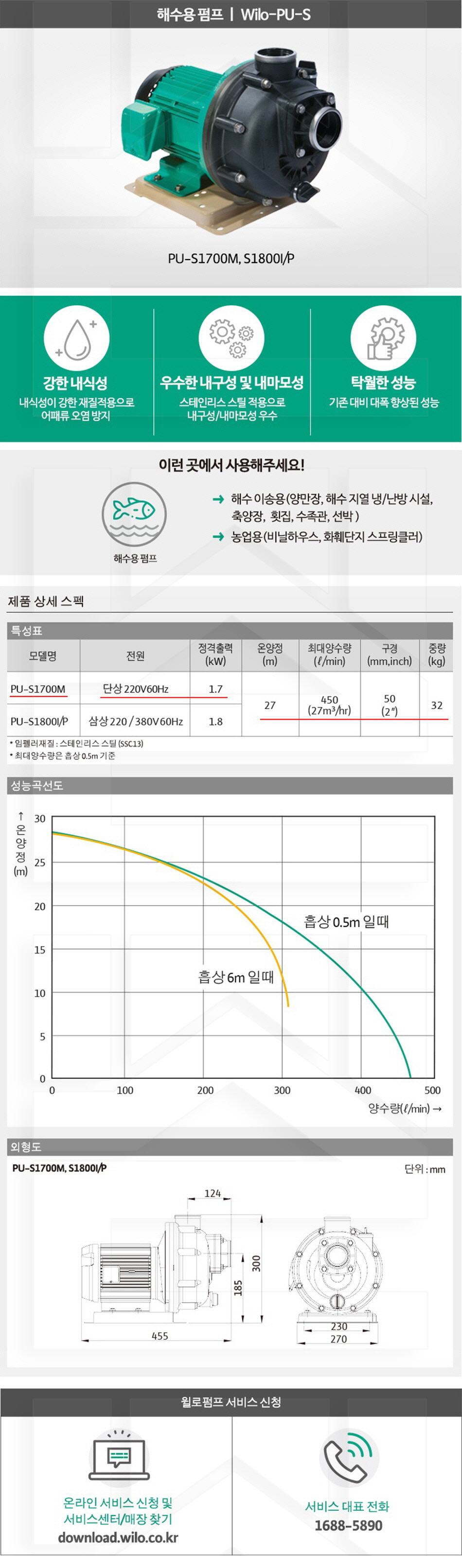 100-27-11-00001700 해수용펌프 스텐임펠러 PU-S1700M 판매가 662,000 ~ 원 배송방법 일반배송 브랜드 제조사 윌로펌프 주식회사 상품옵션 품명 옵션코드 규격 중량 판매단위 회원가 수량 PU-S604M 100-27-11-00000604 40A 12.0kg (12,000g) 0 278,000원 - + PU-S990M/H 100-27-11-00000990 50A 22.0kg (22,000g) 0 533,000원 - + PU-S1700M 100-27-11-00001700 50A 32.0kg (32,000g) 0 662,000원 - + PU-S3001M 100-27-11-00003001 80A 47.0kg (47,000g) 0 785,000원 - + 총 상품 금액(VAT포함) 원 회원 / 비회원 구매하기 상품담기 제품상세정보 상품문의 (0) 배송 안내 반품/교환 안내 해수용 펌프 상품 문의하기 배송안내 배송 안내 일반제품 당일 1시 이전 주문시 재고 여부에 따라 당일발송 재고 부족시 2~3일 소요 파손위험제품 (화물택배/차량배송) 파손위험이 큰 제품은 빠렛트로 포장되어 차량으로 이동됩니다. 고객님이 지정한 장소와 가장 가까운 차량접근이 가능한 도로까지만 배송 주문물량 및 제품의 특성에 따라 화물, 화물택배. 합짐차량. 단독차량으로 고객님의 요청에 따라 운송 차량 지정 제품 하차시 파손이 있을 수 있으므로, 꼭 하차전 제품을 확인 고객센터 고객 센터 010-6539-7900 상담시간 오전 09시 ~ 오후 6시 점심 : 12:00 ~ 13:00 / 휴일 : 토, 일요일, 공휴일 반품/교환 안내 제품의 하자 및 오배송은 문의 주시면 즉시 처리해드리겠습니다. 반품/교환 판매자 지정택배사 : CJ대한통운 반품배송비(편도) : 3,000원 교환배송비(왕복) : 6,000원 보내실 곳 : 전라북도 전주시 완산구 콩쥐팥쥐로 1570 * 반품/교환 사유에 따른 요청 가능 기간 구매자 단순 변심 : 상품수령후 7일이내(구매자 반품 배송비 부담) 반품/교환 불가능 사유 교환/반품 요청 기간이 지난 경우 소비자의 책임 있는 사유로 상품 등이 분실/파손/훼손된 경우 소비자의 사용/소비에 의해 상품 등의 가치가 현저히 감소한 경우 제품을 설치 또는 장착하였을 경우 주문제작 상품중 상품제작에 들어간 경우 제품을 하차 또는 시공 후의 공정과정에서 일어난 파손의 경우 교환 반품시 고객 부담 배송비를 지불하지 아니한 경우 * 펌프제품은 미사용, 포장박스 미훼손 시에만 교환/반품이 가능합니다. 고객센터 고객 센터 010-6539-7900 상담시간 오전 09시 ~ 오후 6시 점심 : 12:00 ~ 13:00 / 휴일 : 토, 일요일, 공휴일
