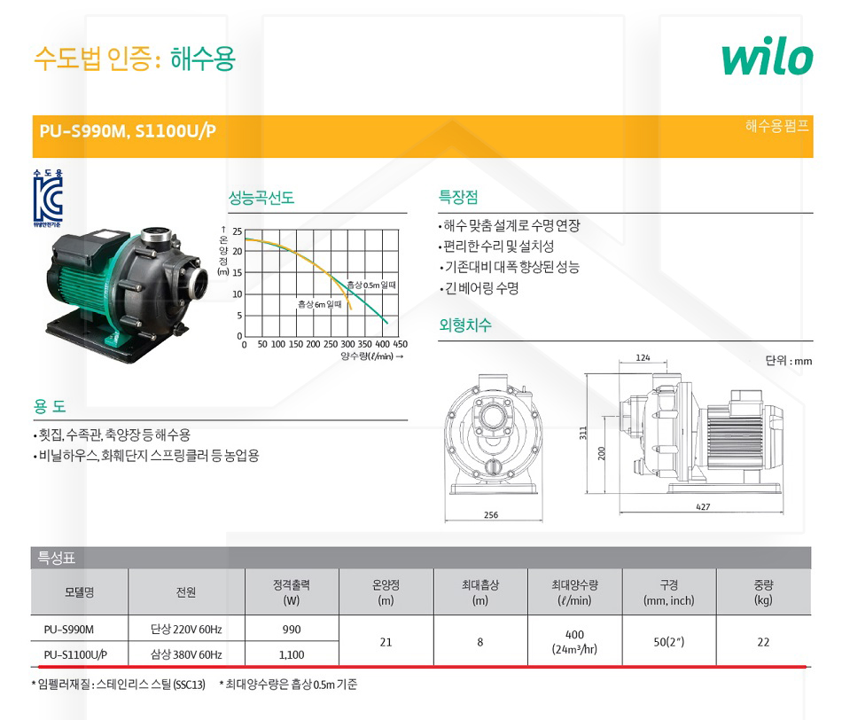 100-27-12-00001100 해수용펌프 스텐임펠러 삼상, 구PU-S990U PU-S1100U/P 판매가 543,000 ~ 원 배송방법 일반배송 브랜드 제조사 윌로펌프 주식회사 상품옵션 품명 옵션코드 규격 중량 판매단위 회원가 수량 PU-S1100U/P 100-27-12-00001100 50A 22.0kg (22,000g) 0 543,000원 - + PU-S1800I/P 100-27-12-00001800 50A 32.0kg (32,000g) 0 662,000원 - + PU-S2200I/P 100-27-12-00002200 80A 47.0kg (47,000g) 0 785,000원 - + 총 상품 금액(VAT포함) 원 회원 / 비회원 구매하기 상품담기 제품상세정보 상품문의 (0) 배송 안내 반품/교환 안내 해수용 펌프 상품 문의하기 배송안내 배송 안내 일반제품 당일 1시 이전 주문시 재고 여부에 따라 당일발송 재고 부족시 2~3일 소요 파손위험제품 (화물택배/차량배송) 파손위험이 큰 제품은 빠렛트로 포장되어 차량으로 이동됩니다. 고객님이 지정한 장소와 가장 가까운 차량접근이 가능한 도로까지만 배송 주문물량 및 제품의 특성에 따라 화물, 화물택배. 합짐차량. 단독차량으로 고객님의 요청에 따라 운송 차량 지정 제품 하차시 파손이 있을 수 있으므로, 꼭 하차전 제품을 확인 고객센터 고객 센터 010-6539-7900 상담시간 오전 09시 ~ 오후 6시 점심 : 12:00 ~ 13:00 / 휴일 : 토, 일요일, 공휴일 반품/교환 안내 제품의 하자 및 오배송은 문의 주시면 즉시 처리해드리겠습니다. 반품/교환 판매자 지정택배사 : CJ대한통운 반품배송비(편도) : 3,000원 교환배송비(왕복) : 6,000원 보내실 곳 : 전라북도 전주시 완산구 콩쥐팥쥐로 1570 * 반품/교환 사유에 따른 요청 가능 기간 구매자 단순 변심 : 상품수령후 7일이내(구매자 반품 배송비 부담) 반품/교환 불가능 사유 교환/반품 요청 기간이 지난 경우 소비자의 책임 있는 사유로 상품 등이 분실/파손/훼손된 경우 소비자의 사용/소비에 의해 상품 등의 가치가 현저히 감소한 경우 제품을 설치 또는 장착하였을 경우 주문제작 상품중 상품제작에 들어간 경우 제품을 하차 또는 시공 후의 공정과정에서 일어난 파손의 경우 교환 반품시 고객 부담 배송비를 지불하지 아니한 경우 * 펌프제품은 미사용, 포장박스 미훼손 시에만 교환/반품이 가능합니다. 고객센터 고객 센터 010-6539-7900 상담시간 오전 09시 ~ 오후 6시 점심 : 12:00 ~ 13:00 / 휴일 : 토, 일요일, 공휴일