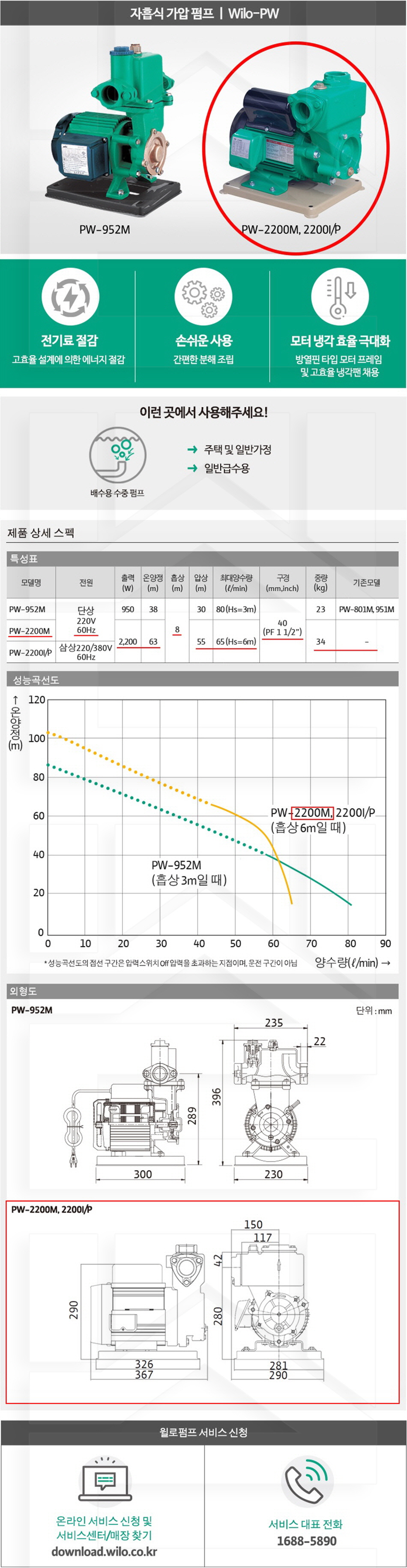 100-31-11-00002200 다목적용, 자흡식가압펌프 PW-2200M 판매가 531,000 ~ 원 배송방법 일반배송 브랜드 제조사 윌로펌프 주식회사 상품옵션 품명 옵션코드 규격 중량 판매단위 회원가 수량 PW-200M 100-31-11-00000200 20A 11.0kg (11,000g) 0 184,000원 - + PW-350M 100-31-11-00000350 25A 13.0kg (13,000g) 0 223,000원 - + PW-351M 100-31-11-00000351 15A 13.0kg (13,000g) 0 218,000원 - + PW-352M 100-31-11-00000352 15A 13.0kg (13,000g) 0 189,000원 - + PW-600M 100-31-11-00000600 32A 17.0kg (17,000g) 0 274,000원 - + PW-952M/H 100-31-11-00000952 40A 23.0kg (23,000g) 0 405,000원 - + PW-2200M 100-31-11-00002200 40A 34.0kg (34,000g) 0 531,000원 - + 총 상품 금액(VAT포함) 원 회원 / 비회원 구매하기 상품담기 제품상세정보 상품문의 (0) 배송 안내 반품/교환 안내 자흡식 가압 펌프 상품 문의하기 배송안내 배송 안내 일반제품 당일 1시 이전 주문시 재고 여부에 따라 당일발송 재고 부족시 2~3일 소요 파손위험제품 (화물택배/차량배송) 파손위험이 큰 제품은 빠렛트로 포장되어 차량으로 이동됩니다. 고객님이 지정한 장소와 가장 가까운 차량접근이 가능한 도로까지만 배송 주문물량 및 제품의 특성에 따라 화물, 화물택배. 합짐차량. 단독차량으로 고객님의 요청에 따라 운송 차량 지정 제품 하차시 파손이 있을 수 있으므로, 꼭 하차전 제품을 확인 고객센터 고객 센터 010-6539-7900 상담시간 오전 09시 ~ 오후 6시 점심 : 12:00 ~ 13:00 / 휴일 : 토, 일요일, 공휴일 반품/교환 안내 제품의 하자 및 오배송은 문의 주시면 즉시 처리해드리겠습니다. 반품/교환 판매자 지정택배사 : CJ대한통운 반품배송비(편도) : 3,000원 교환배송비(왕복) : 6,000원 보내실 곳 : 전라북도 전주시 완산구 콩쥐팥쥐로 1570 * 반품/교환 사유에 따른 요청 가능 기간 구매자 단순 변심 : 상품수령후 7일이내(구매자 반품 배송비 부담) 반품/교환 불가능 사유 교환/반품 요청 기간이 지난 경우 소비자의 책임 있는 사유로 상품 등이 분실/파손/훼손된 경우 소비자의 사용/소비에 의해 상품 등의 가치가 현저히 감소한 경우 제품을 설치 또는 장착하였을 경우 주문제작 상품중 상품제작에 들어간 경우 제품을 하차 또는 시공 후의 공정과정에서 일어난 파손의 경우 교환 반품시 고객 부담 배송비를 지불하지 아니한 경우 * 펌프제품은 미사용, 포장박스 미훼손 시에만 교환/반품이 가능합니다. 고객센터 고객 센터 010-6539-7900 상담시간 오전 09시 ~ 오후 6시 점심 : 12:00 ~ 13:00 / 휴일 : 토, 일요일, 공휴일