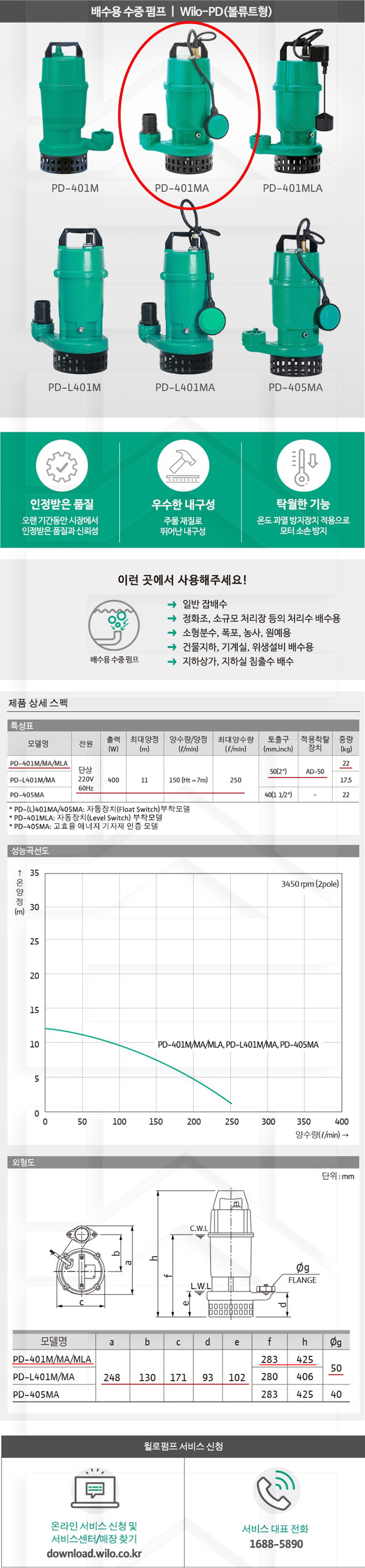 100-54-11-00000401 배수용수중자동, 잡배수용 PD-401MA 판매가 345,000 ~ 원 배송방법 일반배송 브랜드 제조사 윌로펌프 주식회사 상품옵션 품명 옵션코드 규격 중량 판매단위 회원가 수량 PD-401MA 100-54-11-00000401 50A 19.0kg (19,000g) 0 345,000원 - + PD-751MA, PD-951MA 100-54-11-00000751 50A 25.0kg (25,000g) 0 417,000원 - + PD-1505MA 100-54-11-00001505 80A 30.5kg (30,500g) 0 681,000원 - + 총 상품 금액(VAT포함) 원 회원 / 비회원 구매하기 상품담기 제품상세정보 상품문의 (0) 배송 안내 반품/교환 안내 배수용 수중 펌프 볼류트형 상품 문의하기 배송안내 배송 안내 일반제품 당일 1시 이전 주문시 재고 여부에 따라 당일발송 재고 부족시 2~3일 소요 파손위험제품 (화물택배/차량배송) 파손위험이 큰 제품은 빠렛트로 포장되어 차량으로 이동됩니다. 고객님이 지정한 장소와 가장 가까운 차량접근이 가능한 도로까지만 배송 주문물량 및 제품의 특성에 따라 화물, 화물택배. 합짐차량. 단독차량으로 고객님의 요청에 따라 운송 차량 지정 제품 하차시 파손이 있을 수 있으므로, 꼭 하차전 제품을 확인 고객센터 고객 센터 010-6539-7900 상담시간 오전 09시 ~ 오후 6시 점심 : 12:00 ~ 13:00 / 휴일 : 토, 일요일, 공휴일 반품/교환 안내 제품의 하자 및 오배송은 문의 주시면 즉시 처리해드리겠습니다. 반품/교환 판매자 지정택배사 : CJ대한통운 반품배송비(편도) : 3,000원 교환배송비(왕복) : 6,000원 보내실 곳 : 전라북도 전주시 완산구 콩쥐팥쥐로 1570 * 반품/교환 사유에 따른 요청 가능 기간 구매자 단순 변심 : 상품수령후 7일이내(구매자 반품 배송비 부담) 반품/교환 불가능 사유 교환/반품 요청 기간이 지난 경우 소비자의 책임 있는 사유로 상품 등이 분실/파손/훼손된 경우 소비자의 사용/소비에 의해 상품 등의 가치가 현저히 감소한 경우 제품을 설치 또는 장착하였을 경우 주문제작 상품중 상품제작에 들어간 경우 제품을 하차 또는 시공 후의 공정과정에서 일어난 파손의 경우 교환 반품시 고객 부담 배송비를 지불하지 아니한 경우 * 펌프제품은 미사용, 포장박스 미훼손 시에만 교환/반품이 가능합니다. 고객센터 고객 센터 010-6539-7900 상담시간 오전 09시 ~ 오후 6시 점심 : 12:00 ~ 13:00 / 휴일 : 토, 일요일, 공휴일