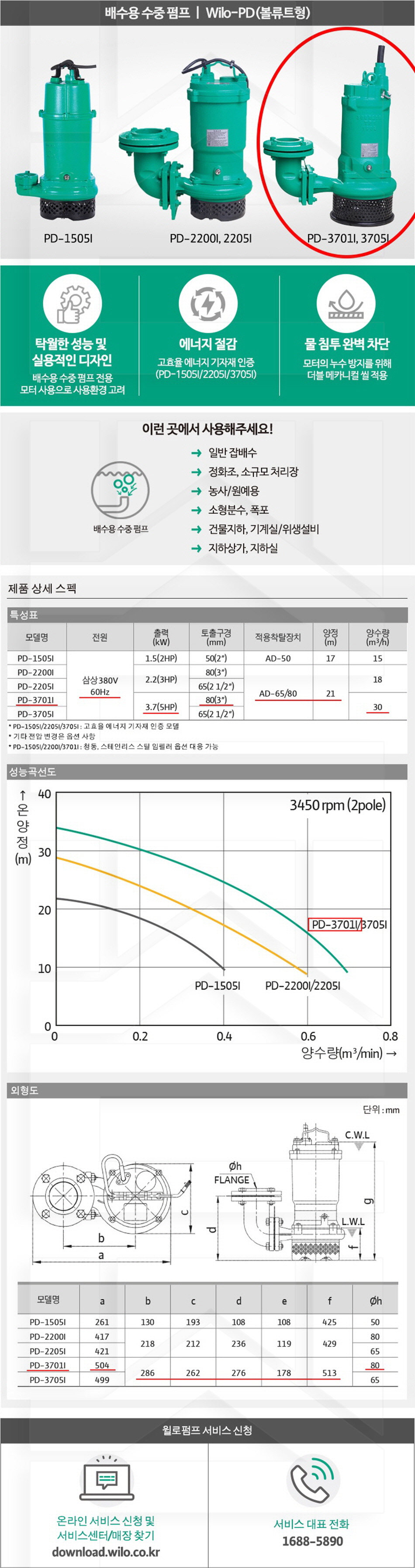 100-54-15-00003701 배수용수중비자동 삼상380, 잡배수용 PD-3701I 판매가 1,075,000 ~ 원 배송방법 일반배송 브랜드 제조사 윌로펌프 주식회사 상품옵션 품명 옵션코드 규격 중량 판매단위 회원가 수량 PD-1505I 100-54-15-00001505 50A 30.0kg (30,000g) 0 656,000원 - + PD-2200I 100-54-15-00002200 80A 50.0kg (50,000g) 0 766,000원 - + PD-3701I 100-54-15-00003701 80A 68.0kg (68,000g) 0 1,075,000원 - + PD-5500I 100-54-15-00005500 80A 80.0kg (80,000g) 0 1,423,000원 - + PD-7500I 100-54-15-00007500 100A 104.0kg (104,000g) 0 1,829,000원 - + PD-11KI 100-54-15-00110000 100A 132.0kg (132,000g) 0 2,594,000원 - + PD-15KI 100-54-15-00150000 100A 150.0kg (150,000g) 0 2,963,000원 - + 총 상품 금액(VAT포함) 원 회원 / 비회원 구매하기 상품담기 제품상세정보 상품문의 (0) 배송 안내 반품/교환 안내 배수용 수중 펌프 볼류트형 상품 문의하기 배송안내 배송 안내 일반제품 당일 1시 이전 주문시 재고 여부에 따라 당일발송 재고 부족시 2~3일 소요 파손위험제품 (화물택배/차량배송) 파손위험이 큰 제품은 빠렛트로 포장되어 차량으로 이동됩니다. 고객님이 지정한 장소와 가장 가까운 차량접근이 가능한 도로까지만 배송 주문물량 및 제품의 특성에 따라 화물, 화물택배. 합짐차량. 단독차량으로 고객님의 요청에 따라 운송 차량 지정 제품 하차시 파손이 있을 수 있으므로, 꼭 하차전 제품을 확인 고객센터 고객 센터 010-6539-7900 상담시간 오전 09시 ~ 오후 6시 점심 : 12:00 ~ 13:00 / 휴일 : 토, 일요일, 공휴일 반품/교환 안내 제품의 하자 및 오배송은 문의 주시면 즉시 처리해드리겠습니다. 반품/교환 판매자 지정택배사 : CJ대한통운 반품배송비(편도) : 3,000원 교환배송비(왕복) : 6,000원 보내실 곳 : 전라북도 전주시 완산구 콩쥐팥쥐로 1570 * 반품/교환 사유에 따른 요청 가능 기간 구매자 단순 변심 : 상품수령후 7일이내(구매자 반품 배송비 부담) 반품/교환 불가능 사유 교환/반품 요청 기간이 지난 경우 소비자의 책임 있는 사유로 상품 등이 분실/파손/훼손된 경우 소비자의 사용/소비에 의해 상품 등의 가치가 현저히 감소한 경우 제품을 설치 또는 장착하였을 경우 주문제작 상품중 상품제작에 들어간 경우 제품을 하차 또는 시공 후의 공정과정에서 일어난 파손의 경우 교환 반품시 고객 부담 배송비를 지불하지 아니한 경우 * 펌프제품은 미사용, 포장박스 미훼손 시에만 교환/반품이 가능합니다. 고객센터 고객 센터 010-6539-7900 상담시간 오전 09시 ~ 오후 6시 점심 : 12:00 ~ 13:00 / 휴일 : 토, 일요일, 공휴일