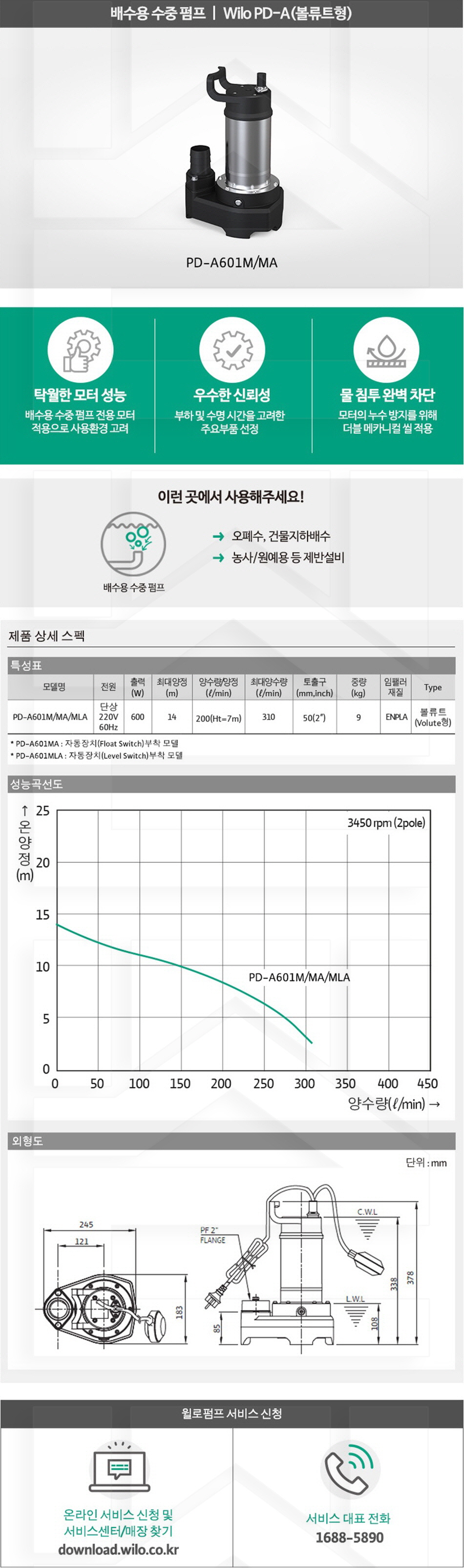 100-56-12-00000601 배수용수중자동레벨스위치형, 알미늄 PD-A601MLA 판매가 356,000 원 배송방법 일반배송 브랜드 제조사 윌로펌프 주식회사 상품옵션 품명 옵션코드 규격 중량 판매단위 회원가 수량 PD-A601MLA 100-56-12-00000601 50A 9.0kg (9,000g) 0 356,000원 - + 총 상품 금액(VAT포함) 원 회원 / 비회원 구매하기 상품담기 제품상세정보 상품문의 (0) 배송 안내 반품/교환 안내 배수용 수중 펌프 볼류트형 상품 문의하기 배송안내 배송 안내 일반제품 당일 1시 이전 주문시 재고 여부에 따라 당일발송 재고 부족시 2~3일 소요 파손위험제품 (화물택배/차량배송) 파손위험이 큰 제품은 빠렛트로 포장되어 차량으로 이동됩니다. 고객님이 지정한 장소와 가장 가까운 차량접근이 가능한 도로까지만 배송 주문물량 및 제품의 특성에 따라 화물, 화물택배. 합짐차량. 단독차량으로 고객님의 요청에 따라 운송 차량 지정 제품 하차시 파손이 있을 수 있으므로, 꼭 하차전 제품을 확인 고객센터 고객 센터 010-6539-7900 상담시간 오전 09시 ~ 오후 6시 점심 : 12:00 ~ 13:00 / 휴일 : 토, 일요일, 공휴일 반품/교환 안내 제품의 하자 및 오배송은 문의 주시면 즉시 처리해드리겠습니다. 반품/교환 판매자 지정택배사 : CJ대한통운 반품배송비(편도) : 3,000원 교환배송비(왕복) : 6,000원 보내실 곳 : 전라북도 전주시 완산구 콩쥐팥쥐로 1570 * 반품/교환 사유에 따른 요청 가능 기간 구매자 단순 변심 : 상품수령후 7일이내(구매자 반품 배송비 부담) 반품/교환 불가능 사유 교환/반품 요청 기간이 지난 경우 소비자의 책임 있는 사유로 상품 등이 분실/파손/훼손된 경우 소비자의 사용/소비에 의해 상품 등의 가치가 현저히 감소한 경우 제품을 설치 또는 장착하였을 경우 주문제작 상품중 상품제작에 들어간 경우 제품을 하차 또는 시공 후의 공정과정에서 일어난 파손의 경우 교환 반품시 고객 부담 배송비를 지불하지 아니한 경우 * 펌프제품은 미사용, 포장박스 미훼손 시에만 교환/반품이 가능합니다. 고객센터 고객 센터 010-6539-7900 상담시간 오전 09시 ~ 오후 6시 점심 : 12:00 ~ 13:00 / 휴일 : 토, 일요일, 공휴일