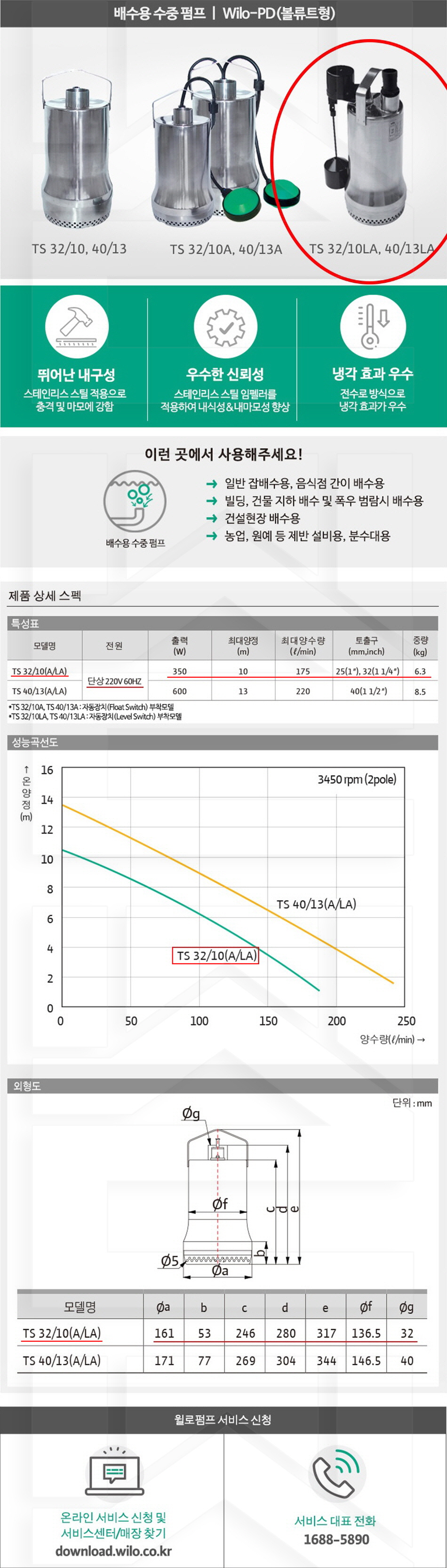 100-59-12-00003210 배수용수중자동레벨스위치형, 올스텐 TS32/10LA 판매가 319,000 ~ 원 배송방법 일반배송 브랜드 제조사 윌로펌프 주식회사 상품옵션 품명 옵션코드 규격 중량 판매단위 회원가 수량 TS32/10LA 100-59-12-00003210 32/25A 6.3kg (6,300g) 0 319,000원 - + TS40/13LA 100-59-12-00004013 40A 8.5kg (8,500g) 0 423,000원 - + 총 상품 금액(VAT포함) 원 회원 / 비회원 구매하기 상품담기 제품상세정보 상품문의 (0) 배송 안내 반품/교환 안내 배수용 수중 펌프 볼류트형 상품 문의하기 배송안내 배송 안내 일반제품 당일 1시 이전 주문시 재고 여부에 따라 당일발송 재고 부족시 2~3일 소요 파손위험제품 (화물택배/차량배송) 파손위험이 큰 제품은 빠렛트로 포장되어 차량으로 이동됩니다. 고객님이 지정한 장소와 가장 가까운 차량접근이 가능한 도로까지만 배송 주문물량 및 제품의 특성에 따라 화물, 화물택배. 합짐차량. 단독차량으로 고객님의 요청에 따라 운송 차량 지정 제품 하차시 파손이 있을 수 있으므로, 꼭 하차전 제품을 확인 고객센터 고객 센터 010-6539-7900 상담시간 오전 09시 ~ 오후 6시 점심 : 12:00 ~ 13:00 / 휴일 : 토, 일요일, 공휴일 반품/교환 안내 제품의 하자 및 오배송은 문의 주시면 즉시 처리해드리겠습니다. 반품/교환 판매자 지정택배사 : CJ대한통운 반품배송비(편도) : 3,000원 교환배송비(왕복) : 6,000원 보내실 곳 : 전라북도 전주시 완산구 콩쥐팥쥐로 1570 * 반품/교환 사유에 따른 요청 가능 기간 구매자 단순 변심 : 상품수령후 7일이내(구매자 반품 배송비 부담) 반품/교환 불가능 사유 교환/반품 요청 기간이 지난 경우 소비자의 책임 있는 사유로 상품 등이 분실/파손/훼손된 경우 소비자의 사용/소비에 의해 상품 등의 가치가 현저히 감소한 경우 제품을 설치 또는 장착하였을 경우 주문제작 상품중 상품제작에 들어간 경우 제품을 하차 또는 시공 후의 공정과정에서 일어난 파손의 경우 교환 반품시 고객 부담 배송비를 지불하지 아니한 경우 * 펌프제품은 미사용, 포장박스 미훼손 시에만 교환/반품이 가능합니다. 고객센터 고객 센터 010-6539-7900 상담시간 오전 09시 ~ 오후 6시 점심 : 12:00 ~ 13:00 / 휴일 : 토, 일요일, 공휴일