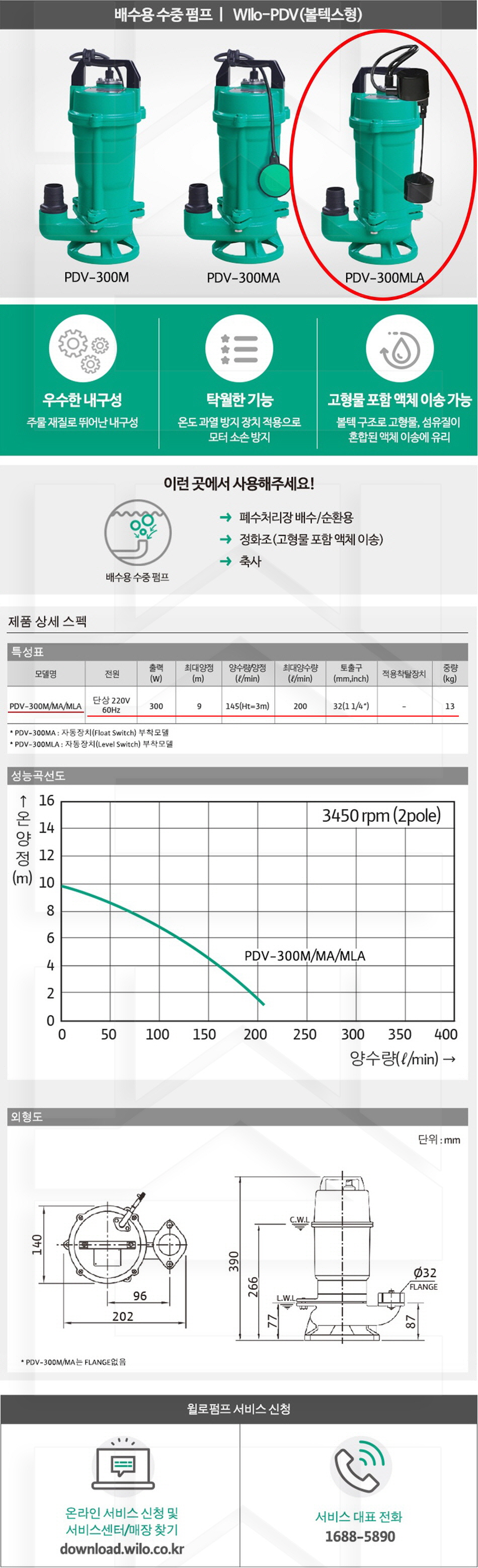 100-62-12-00000300 오수자동레벨스위치형, 구PDV-270MLA) PDV-300MLA 판매가 252,000 ~ 원 배송방법 일반배송 브랜드 제조사 윌로펌프 주식회사 상품옵션 품명 옵션코드 규격 중량 판매단위 회원가 수량 PDV-300MLA 100-62-12-00000300 32A 13.0kg (13,000g) 0 252,000원 - + PDV-400MLA 100-62-12-00000400 50A 20.0kg (20,000g) 0 382,000원 - + 총 상품 금액(VAT포함) 원 회원 / 비회원 구매하기 상품담기 제품상세정보 상품문의 (0) 배송 안내 반품/교환 안내 배수용 수중 펌프 볼텍스형 상품 문의하기 배송안내 배송 안내 일반제품 당일 1시 이전 주문시 재고 여부에 따라 당일발송 재고 부족시 2~3일 소요 파손위험제품 (화물택배/차량배송) 파손위험이 큰 제품은 빠렛트로 포장되어 차량으로 이동됩니다. 고객님이 지정한 장소와 가장 가까운 차량접근이 가능한 도로까지만 배송 주문물량 및 제품의 특성에 따라 화물, 화물택배. 합짐차량. 단독차량으로 고객님의 요청에 따라 운송 차량 지정 제품 하차시 파손이 있을 수 있으므로, 꼭 하차전 제품을 확인 고객센터 고객 센터 010-6539-7900 상담시간 오전 09시 ~ 오후 6시 점심 : 12:00 ~ 13:00 / 휴일 : 토, 일요일, 공휴일 반품/교환 안내 제품의 하자 및 오배송은 문의 주시면 즉시 처리해드리겠습니다. 반품/교환 판매자 지정택배사 : CJ대한통운 반품배송비(편도) : 3,000원 교환배송비(왕복) : 6,000원 보내실 곳 : 전라북도 전주시 완산구 콩쥐팥쥐로 1570 * 반품/교환 사유에 따른 요청 가능 기간 구매자 단순 변심 : 상품수령후 7일이내(구매자 반품 배송비 부담) 반품/교환 불가능 사유 교환/반품 요청 기간이 지난 경우 소비자의 책임 있는 사유로 상품 등이 분실/파손/훼손된 경우 소비자의 사용/소비에 의해 상품 등의 가치가 현저히 감소한 경우 제품을 설치 또는 장착하였을 경우 주문제작 상품중 상품제작에 들어간 경우 제품을 하차 또는 시공 후의 공정과정에서 일어난 파손의 경우 교환 반품시 고객 부담 배송비를 지불하지 아니한 경우 * 펌프제품은 미사용, 포장박스 미훼손 시에만 교환/반품이 가능합니다. 고객센터 고객 센터 010-6539-7900 상담시간 오전 09시 ~ 오후 6시 점심 : 12:00 ~ 13:00 / 휴일 : 토, 일요일, 공휴일
