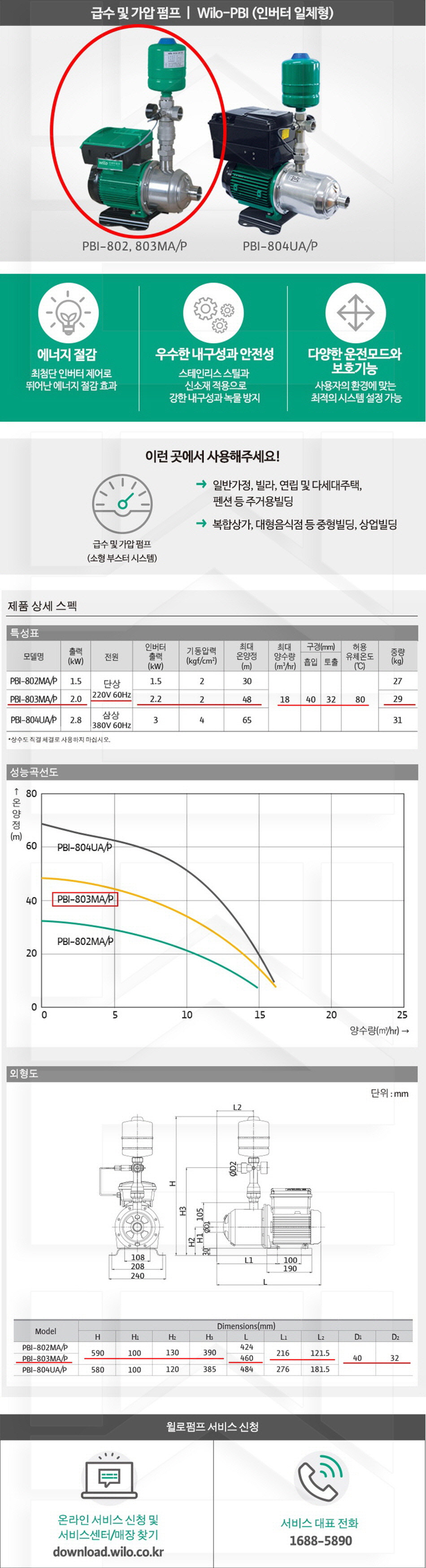 101-32-12-00000803 인버터 일체형펌프 PBI-L시리즈 PBI-L803MA/P (1.85W) 판매가 1,472,000 ~ 원 배송방법 일반배송 브랜드 제조사 윌로펌프 주식회사 상품옵션 품명 옵션코드 규격 중량 판매단위 회원가 수량 PBI-L203MA/P (0.75W) 101-32-12-00000203 25A 16.0kg (16,000g) 0 1,016,000원 - + PBI-L205MA/P(1.1W) 101-32-12-00000205 25A 17.0kg (17,000g) 0 1,098,000원 - + PBI-L402MA/P (0.75W) 101-32-12-00000402 32/25A 14.0kg (14,000g) 0 1,016,000원 - + PBI-L403MA/P (1.1W) 101-32-12-00000403 32/25A 18.0kg (18,000g) 0 1,098,000원 - + PBI-L404MA/P (1.5W) 101-32-12-00000404 32/25A 18.0kg (18,000g) 0 1,150,000원 - + PBI-L405MA/P (1.85W) 101-32-12-00000405 32/25A 19.0kg (19,000g) 0 1,361,000원 - + PBI-L802MA/P (1.5W) 101-32-12-00000802 40/32A 19.0kg (19,000g) 0 1,295,000원 - + PBI-L803MA/P (1.85W) 101-32-12-00000803 40/32A 20.0kg (20,000g) 0 1,472,000원 - + 총 상품 금액(VAT포함) 원 회원 / 비회원 구매하기 상품담기 제품상세정보 상품문의 (0) 배송 안내 반품/교환 안내 급수 가압 펌프 인버터 일체형 상품 문의하기 배송안내 배송 안내 일반제품 당일 1시 이전 주문시 재고 여부에 따라 당일발송 재고 부족시 2~3일 소요 파손위험제품 (화물택배/차량배송) 파손위험이 큰 제품은 빠렛트로 포장되어 차량으로 이동됩니다. 고객님이 지정한 장소와 가장 가까운 차량접근이 가능한 도로까지만 배송 주문물량 및 제품의 특성에 따라 화물, 화물택배. 합짐차량. 단독차량으로 고객님의 요청에 따라 운송 차량 지정 제품 하차시 파손이 있을 수 있으므로, 꼭 하차전 제품을 확인 고객센터 고객 센터 010-6539-7900 상담시간 오전 09시 ~ 오후 6시 점심 : 12:00 ~ 13:00 / 휴일 : 토, 일요일, 공휴일 반품/교환 안내 제품의 하자 및 오배송은 문의 주시면 즉시 처리해드리겠습니다. 반품/교환 판매자 지정택배사 : CJ대한통운 반품배송비(편도) : 3,000원 교환배송비(왕복) : 6,000원 보내실 곳 : 전라북도 전주시 완산구 콩쥐팥쥐로 1570 * 반품/교환 사유에 따른 요청 가능 기간 구매자 단순 변심 : 상품수령후 7일이내(구매자 반품 배송비 부담) 반품/교환 불가능 사유 교환/반품 요청 기간이 지난 경우 소비자의 책임 있는 사유로 상품 등이 분실/파손/훼손된 경우 소비자의 사용/소비에 의해 상품 등의 가치가 현저히 감소한 경우 제품을 설치 또는 장착하였을 경우 주문제작 상품중 상품제작에 들어간 경우 제품을 하차 또는 시공 후의 공정과정에서 일어난 파손의 경우 교환 반품시 고객 부담 배송비를 지불하지 아니한 경우 * 펌프제품은 미사용, 포장박스 미훼손 시에만 교환/반품이 가능합니다. 고객센터 고객 센터 010-6539-7900 상담시간 오전 09시 ~ 오후 6시 점심 : 12:00 ~ 13:00 / 휴일 : 토, 일요일, 공휴일