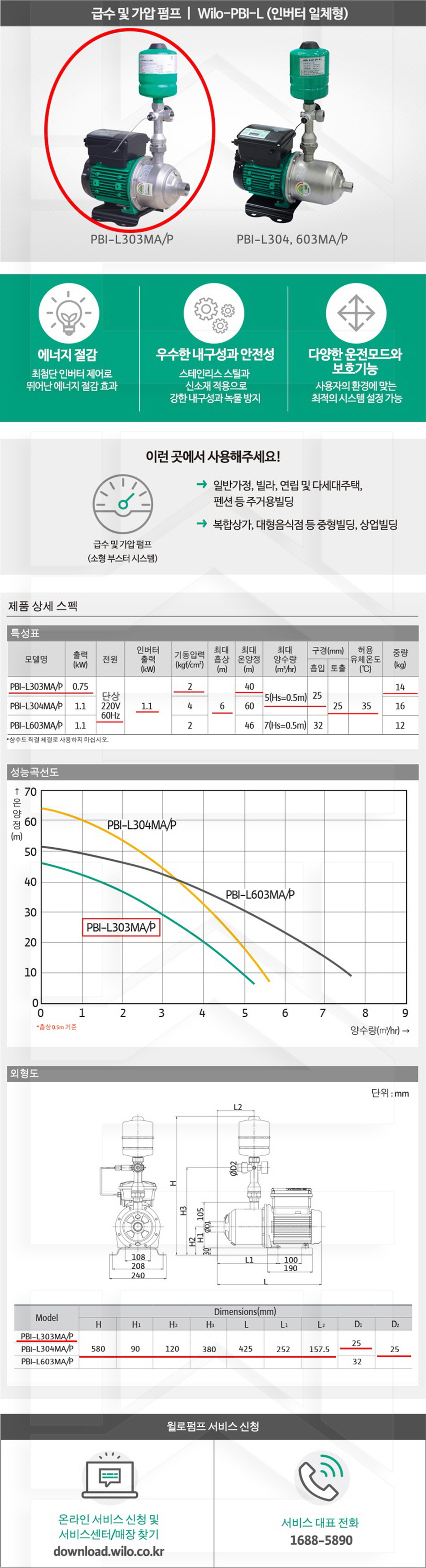 101-32-13-00000303 자흡식 인버터 펌프 PBI-L303MA/P (0.75W) 판매가 996,000 ~ 원 배송방법 일반배송 브랜드 제조사 윌로펌프 주식회사 상품옵션 품명 옵션코드 규격 중량 판매단위 회원가 수량 PBI-L303MA/P (0.75W) 101-32-13-00000303 25A 14.0kg (14,000g) 0 996,000원 - + PBI-L304MA/P (1.1W) 101-32-13-00000304 25A 16.0kg (16,000g) 0 1,046,000원 - + PBI-L603MA/P (1.1W) 101-32-13-00000603 32/25A 12.0kg (12,000g) 0 1,046,000원 - + PBI-L991MA/P (1.5W) 101-32-13-00000991 40/32A 19.0kg (19,000g) 0 1,229,000원 - + 총 상품 금액(VAT포함) 원 회원 / 비회원 구매하기 상품담기 제품상세정보 상품문의 (0) 배송 안내 반품/교환 안내 급수 가압 펌프 인버터 일체형 상품 문의하기 배송안내 배송 안내 일반제품 당일 1시 이전 주문시 재고 여부에 따라 당일발송 재고 부족시 2~3일 소요 파손위험제품 (화물택배/차량배송) 파손위험이 큰 제품은 빠렛트로 포장되어 차량으로 이동됩니다. 고객님이 지정한 장소와 가장 가까운 차량접근이 가능한 도로까지만 배송 주문물량 및 제품의 특성에 따라 화물, 화물택배. 합짐차량. 단독차량으로 고객님의 요청에 따라 운송 차량 지정 제품 하차시 파손이 있을 수 있으므로, 꼭 하차전 제품을 확인 고객센터 고객 센터 010-6539-7900 상담시간 오전 09시 ~ 오후 6시 점심 : 12:00 ~ 13:00 / 휴일 : 토, 일요일, 공휴일 반품/교환 안내 제품의 하자 및 오배송은 문의 주시면 즉시 처리해드리겠습니다. 반품/교환 판매자 지정택배사 : CJ대한통운 반품배송비(편도) : 3,000원 교환배송비(왕복) : 6,000원 보내실 곳 : 전라북도 전주시 완산구 콩쥐팥쥐로 1570 * 반품/교환 사유에 따른 요청 가능 기간 구매자 단순 변심 : 상품수령후 7일이내(구매자 반품 배송비 부담) 반품/교환 불가능 사유 교환/반품 요청 기간이 지난 경우 소비자의 책임 있는 사유로 상품 등이 분실/파손/훼손된 경우 소비자의 사용/소비에 의해 상품 등의 가치가 현저히 감소한 경우 제품을 설치 또는 장착하였을 경우 주문제작 상품중 상품제작에 들어간 경우 제품을 하차 또는 시공 후의 공정과정에서 일어난 파손의 경우 교환 반품시 고객 부담 배송비를 지불하지 아니한 경우 * 펌프제품은 미사용, 포장박스 미훼손 시에만 교환/반품이 가능합니다. 고객센터 고객 센터 010-6539-7900 상담시간 오전 09시 ~ 오후 6시 점심 : 12:00 ~ 13:00 / 휴일 : 토, 일요일, 공휴일