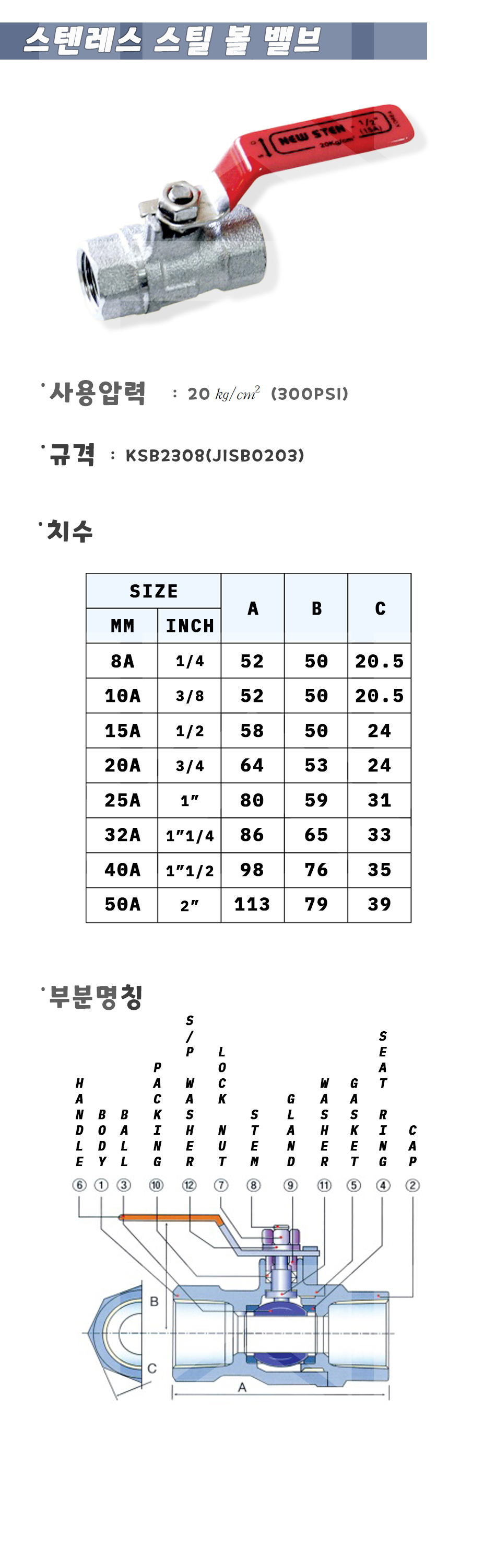 002-21-21-00000008 스텐 볼밸브 2PCS 뉴스텐 판매가 13,040 ~ 원 배송방법 일반배송 브랜드 제조사 상품옵션 품명 옵션코드 규격 중량 판매단위 회원가 수량 스텐 볼밸브 2PCS 뉴스텐 002-21-21-00000008 8A 0.2kg (190g) 0 13,040원 - + 스텐 볼밸브 2PCS 뉴스텐 002-21-21-00000010 10A 0.1kg (110g) 0 13,040원 - + 스텐 볼밸브 2PCS 뉴스텐 002-21-21-00000015 15A 0.2kg (210g) 0 13,040원 - + 스텐 볼밸브 2PCS 뉴스텐 002-21-21-00000020 20A 0.3kg (340g) 0 16,920원 - + 스텐 볼밸브 2PCS 뉴스텐 002-21-21-00000025 25A 0.4kg (436g) 0 20,620원 - + 스텐 볼밸브 2PCS 뉴스텐 002-21-21-00000032 32A 0.8kg (830g) 0 31,110원 - + 스텐 볼밸브 2PCS 뉴스텐 002-21-21-00000040 40A 1.2kg (1,210g) 0 38,560원 - + 스텐 볼밸브 2PCS 뉴스텐 002-21-21-00000050 50A 2.0kg (2,020g) 0 57,420원 - + 총 상품 금액(VAT포함) 원 회원 / 비회원 구매하기 상품담기 제품상세정보 상품문의 (0) 배송 안내 반품/교환 안내 스텐 볼밸브 2PCS 상품 문의하기 배송안내 배송 안내 일반제품 당일 1시 이전 주문시 재고 여부에 따라 당일발송 재고 부족시 2~3일 소요 파손위험제품 (화물택배/차량배송) 파손위험이 큰 제품은 빠렛트로 포장되어 차량으로 이동됩니다. 고객님이 지정한 장소와 가장 가까운 차량접근이 가능한 도로까지만 배송 주문물량 및 제품의 특성에 따라 화물, 화물택배. 합짐차량. 단독차량으로 고객님의 요청에 따라 운송 차량 지정 제품 하차시 파손이 있을 수 있으므로, 꼭 하차전 제품을 확인 고객센터 고객 센터 010-6539-7900 상담시간 오전 09시 ~ 오후 6시 점심 : 12:00 ~ 13:00 / 휴일 : 토, 일요일, 공휴일 반품/교환 안내 제품의 하자 및 오배송은 문의 주시면 즉시 처리해드리겠습니다. 반품/교환 판매자 지정택배사 : CJ대한통운 반품배송비(편도) : 3,000원 교환배송비(왕복) : 6,000원 보내실 곳 : 전라북도 전주시 완산구 콩쥐팥쥐로 1570 * 반품/교환 사유에 따른 요청 가능 기간 구매자 단순 변심 : 상품수령후 7일이내(구매자 반품 배송비 부담) 반품/교환 불가능 사유 교환/반품 요청 기간이 지난 경우 소비자의 책임 있는 사유로 상품 등이 분실/파손/훼손된 경우 소비자의 사용/소비에 의해 상품 등의 가치가 현저히 감소한 경우 제품을 설치 또는 장착하였을 경우 주문제작 상품중 상품제작에 들어간 경우 제품을 하차 또는 시공 후의 공정과정에서 일어난 파손의 경우 교환 반품시 고객 부담 배송비를 지불하지 아니한 경우 * 펌프제품은 미사용, 포장박스 미훼손 시에만 교환/반품이 가능합니다. 고객센터 고객 센터 010-6539-7900 상담시간 오전 09시 ~ 오후 6시 점심 : 12:00 ~ 13:00 / 휴일 : 토, 일요일, 공휴일