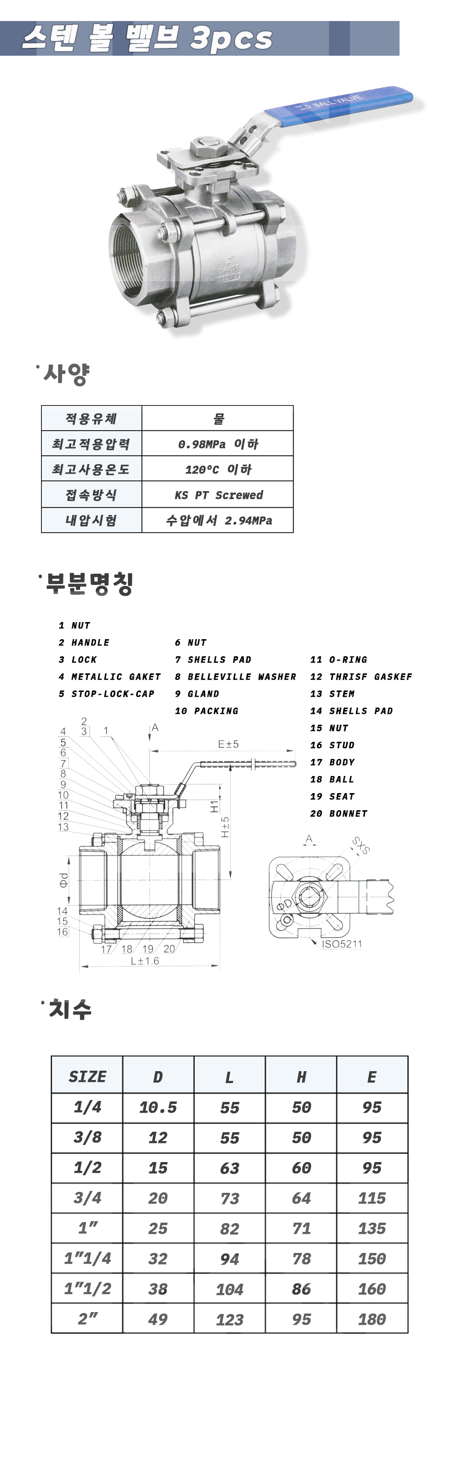 002-22-02-00000015 스텐 볼밸브 3-PCS 판매가 11,700 ~ 원 배송방법 일반배송 브랜드 제조사 상품옵션 품명 옵션코드 규격 중량 판매단위 회원가 수량 스텐 볼밸브 3-PCS 002-22-02-00000015 15A 0.4kg (441g) 0 11,700원 - + 스텐 볼밸브 3-PCS 002-22-02-00000020 20A 0.6kg (606g) 0 16,000원 - + 스텐 볼밸브 3-PCS 002-22-02-00000025 25A 0.8kg (821g) 0 22,000원 - + 스텐 볼밸브 3-PCS 002-22-02-00000032 32A 1.5kg (1,484g) 0 31,800원 - + 스텐 볼밸브 3-PCS 002-22-02-00000040 40A 1.8kg (1,815g) 0 44,000원 - + 스텐 볼밸브 3-PCS 002-22-02-00000050 50A 3.1kg (3,124g) 0 65,000원 - + 총 상품 금액(VAT포함) 원 회원 / 비회원 구매하기 상품담기 제품상세정보 상품문의 (0) 배송 안내 반품/교환 안내 스텐 볼밸브 2PCS 상품 문의하기 배송안내 배송 안내 일반제품 당일 1시 이전 주문시 재고 여부에 따라 당일발송 재고 부족시 2~3일 소요 파손위험제품 (화물택배/차량배송) 파손위험이 큰 제품은 빠렛트로 포장되어 차량으로 이동됩니다. 고객님이 지정한 장소와 가장 가까운 차량접근이 가능한 도로까지만 배송 주문물량 및 제품의 특성에 따라 화물, 화물택배. 합짐차량. 단독차량으로 고객님의 요청에 따라 운송 차량 지정 제품 하차시 파손이 있을 수 있으므로, 꼭 하차전 제품을 확인 고객센터 고객 센터 010-6539-7900 상담시간 오전 09시 ~ 오후 6시 점심 : 12:00 ~ 13:00 / 휴일 : 토, 일요일, 공휴일 반품/교환 안내 제품의 하자 및 오배송은 문의 주시면 즉시 처리해드리겠습니다. 반품/교환 판매자 지정택배사 : CJ대한통운 반품배송비(편도) : 3,000원 교환배송비(왕복) : 6,000원 보내실 곳 : 전라북도 전주시 완산구 콩쥐팥쥐로 1570 * 반품/교환 사유에 따른 요청 가능 기간 구매자 단순 변심 : 상품수령후 7일이내(구매자 반품 배송비 부담) 반품/교환 불가능 사유 교환/반품 요청 기간이 지난 경우 소비자의 책임 있는 사유로 상품 등이 분실/파손/훼손된 경우 소비자의 사용/소비에 의해 상품 등의 가치가 현저히 감소한 경우 제품을 설치 또는 장착하였을 경우 주문제작 상품중 상품제작에 들어간 경우 제품을 하차 또는 시공 후의 공정과정에서 일어난 파손의 경우 교환 반품시 고객 부담 배송비를 지불하지 아니한 경우 * 펌프제품은 미사용, 포장박스 미훼손 시에만 교환/반품이 가능합니다. 고객센터 고객 센터 010-6539-7900 상담시간 오전 09시 ~ 오후 6시 점심 : 12:00 ~ 13:00 / 휴일 : 토, 일요일, 공휴일